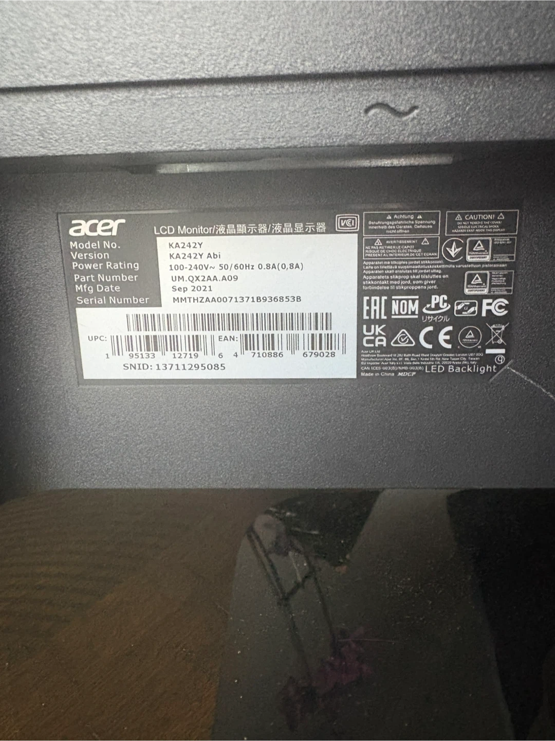 Selling an Acer KA242Y LCD Monitor. The manufacturing date is September 2023. It's in great condition and ready for a new setup