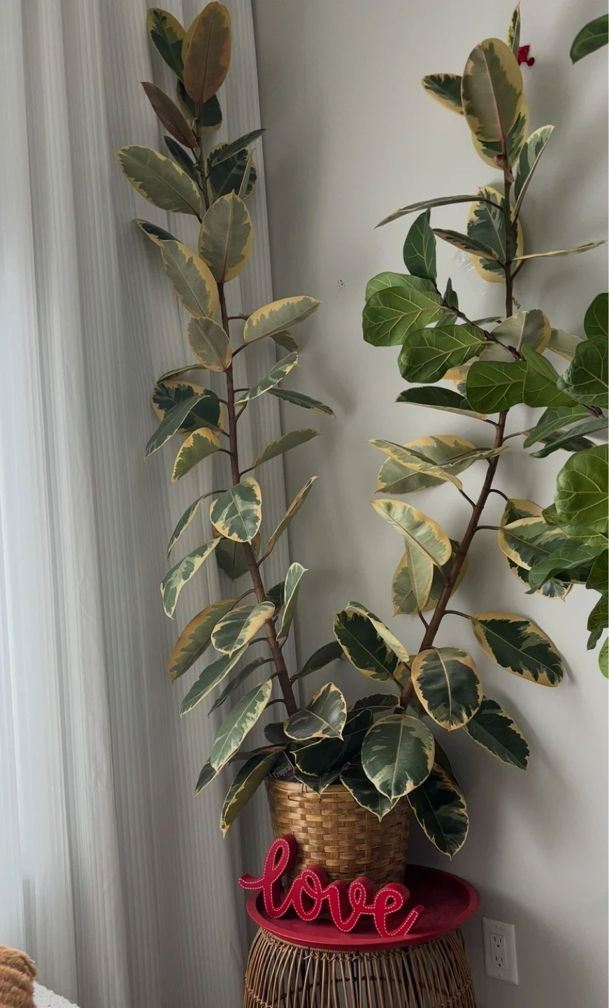 A mature variegated rubber plant in a woven basket. It features large, glossy leaves with cream and green variegation. This plant adds a vibrant touch to any indoor space.