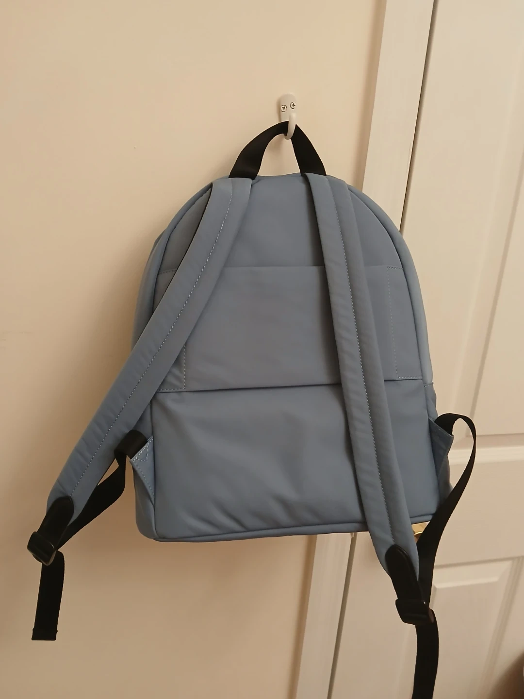 This is a blue DKNY backpack made of nylon.