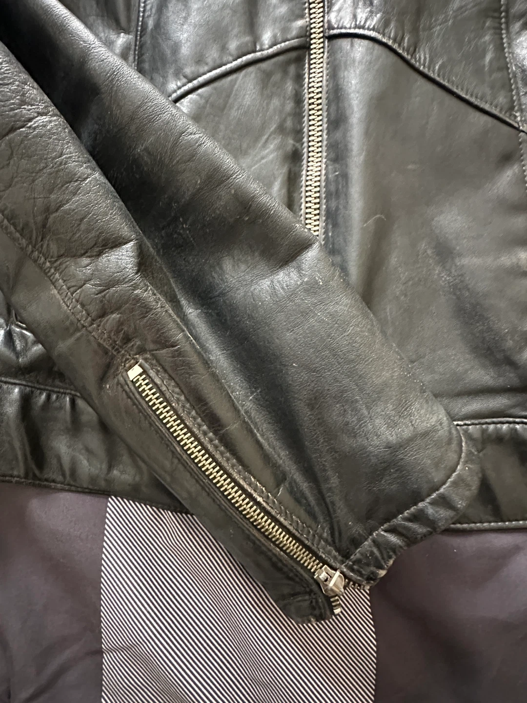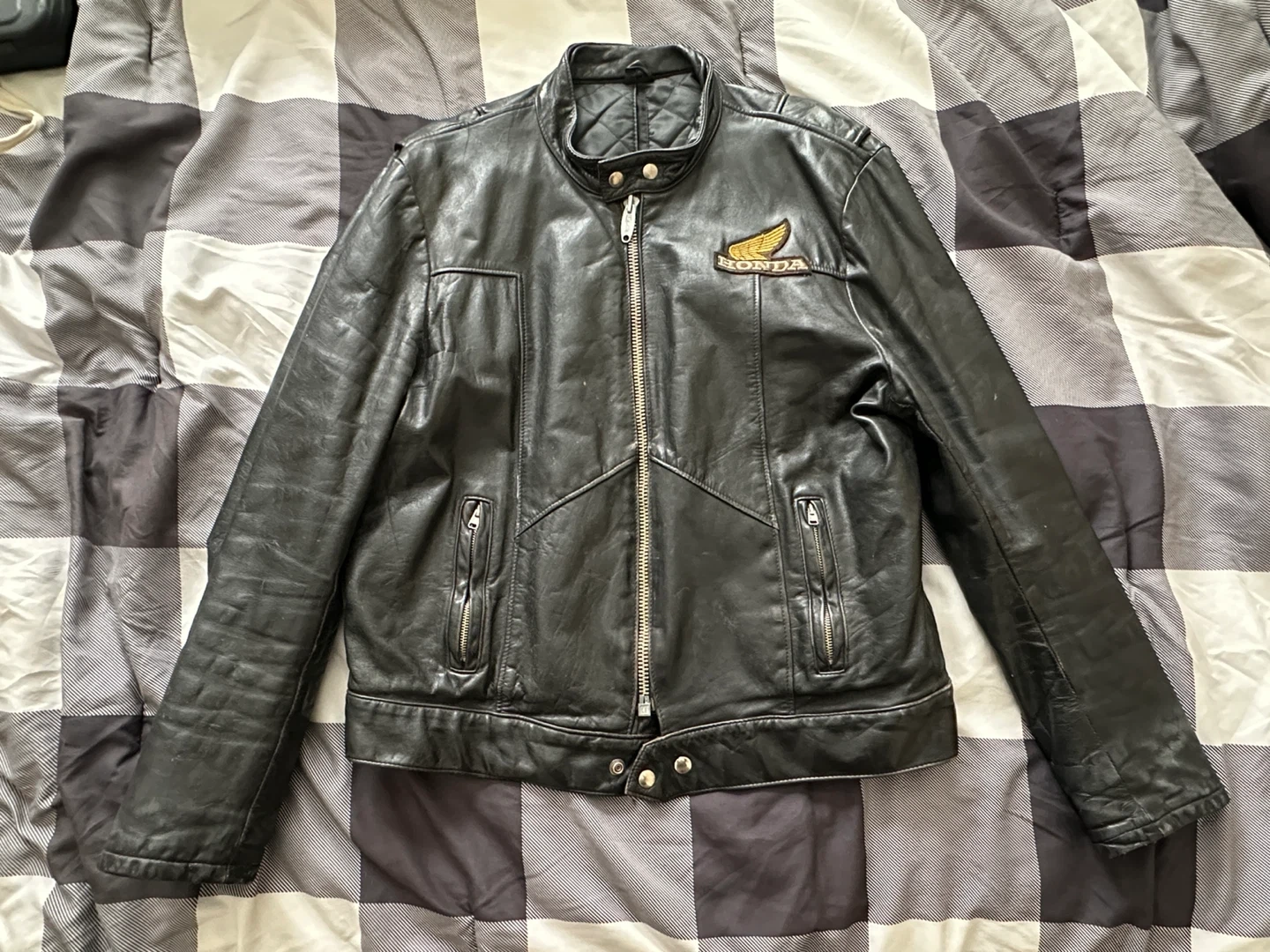 Classic black leather motorcycle jacket with a Honda wing logo patch. It's a size medium with zippered pockets and cuffs. Great for motorcycle enthusiasts!