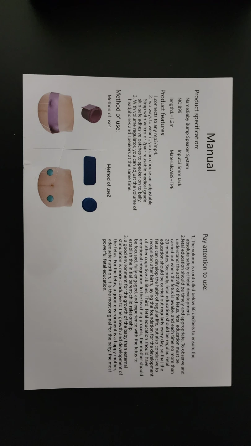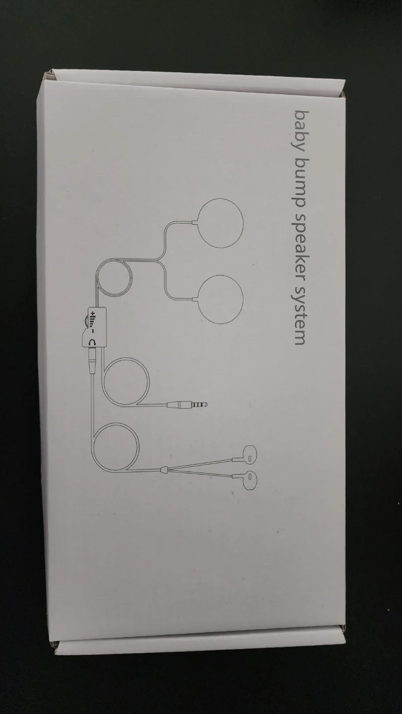 This is a baby bump speaker system. It connects to any mp3/3.5mm jack. Includes headphones and speakers. Adjustable strap with velcro.