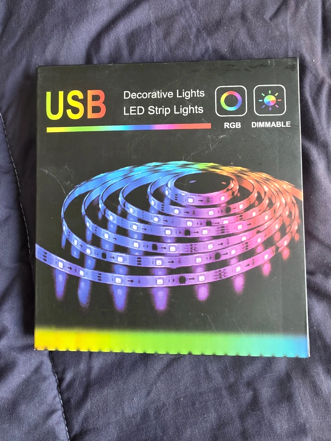 Decorative USB LED strip lights for creating ambient lighting. These lights are dimmable and offer RGB color options. Includes LED strip, controller, and power supply. Made in China.