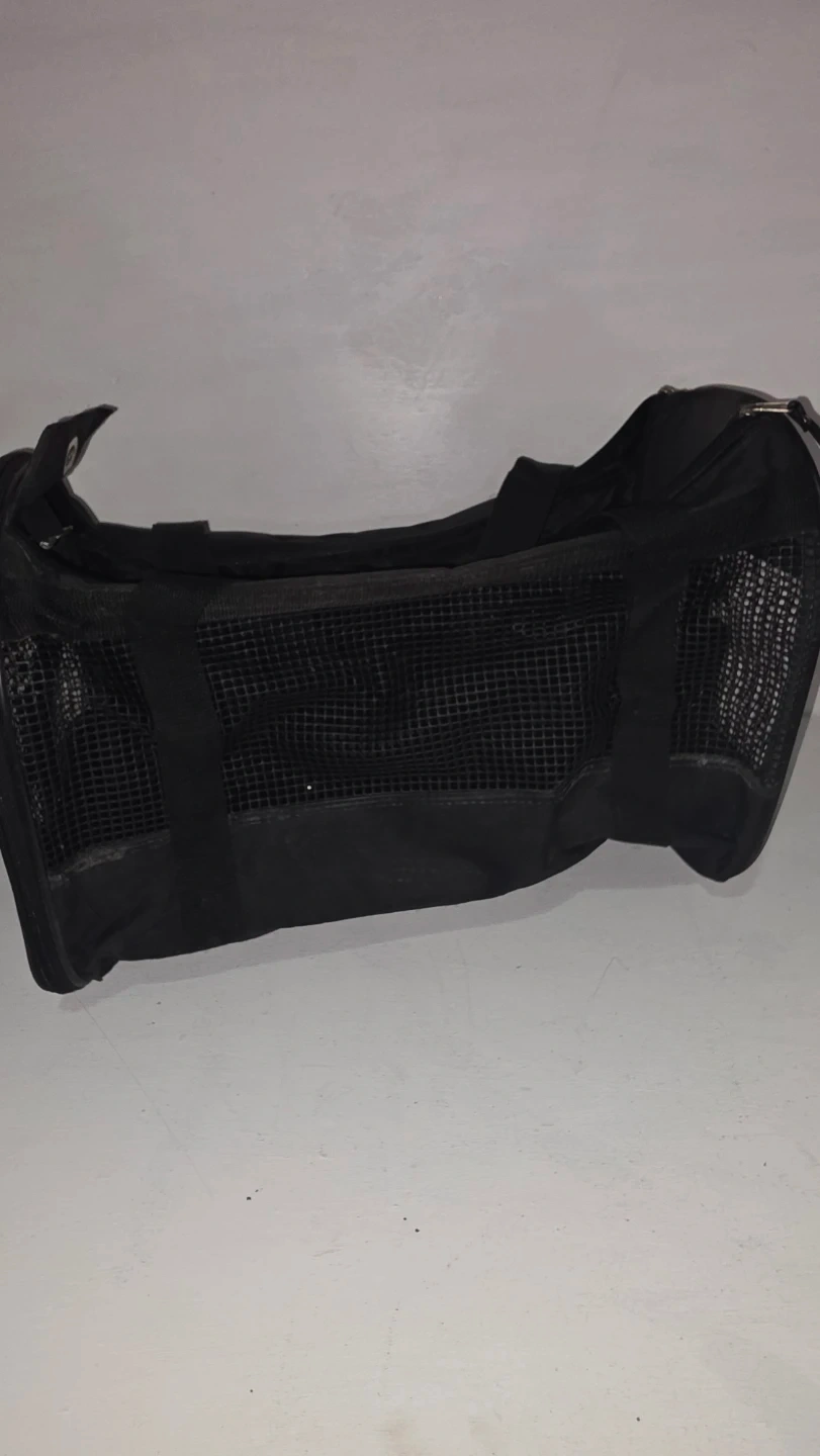This is a black pet carrier bag, suitable for small animals. It features mesh panels for ventilation on multiple sides. It comes with a removable, washable mat for comfort. Great for travel!