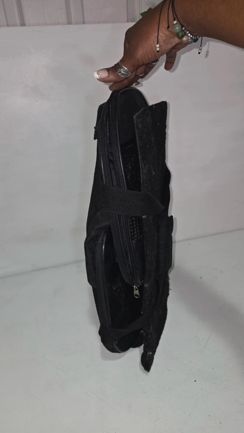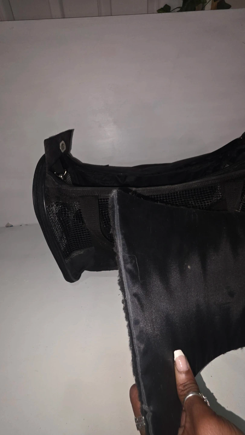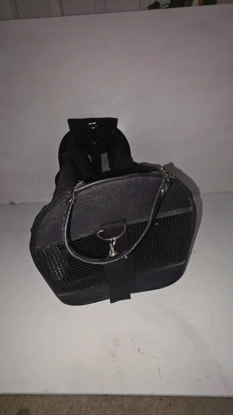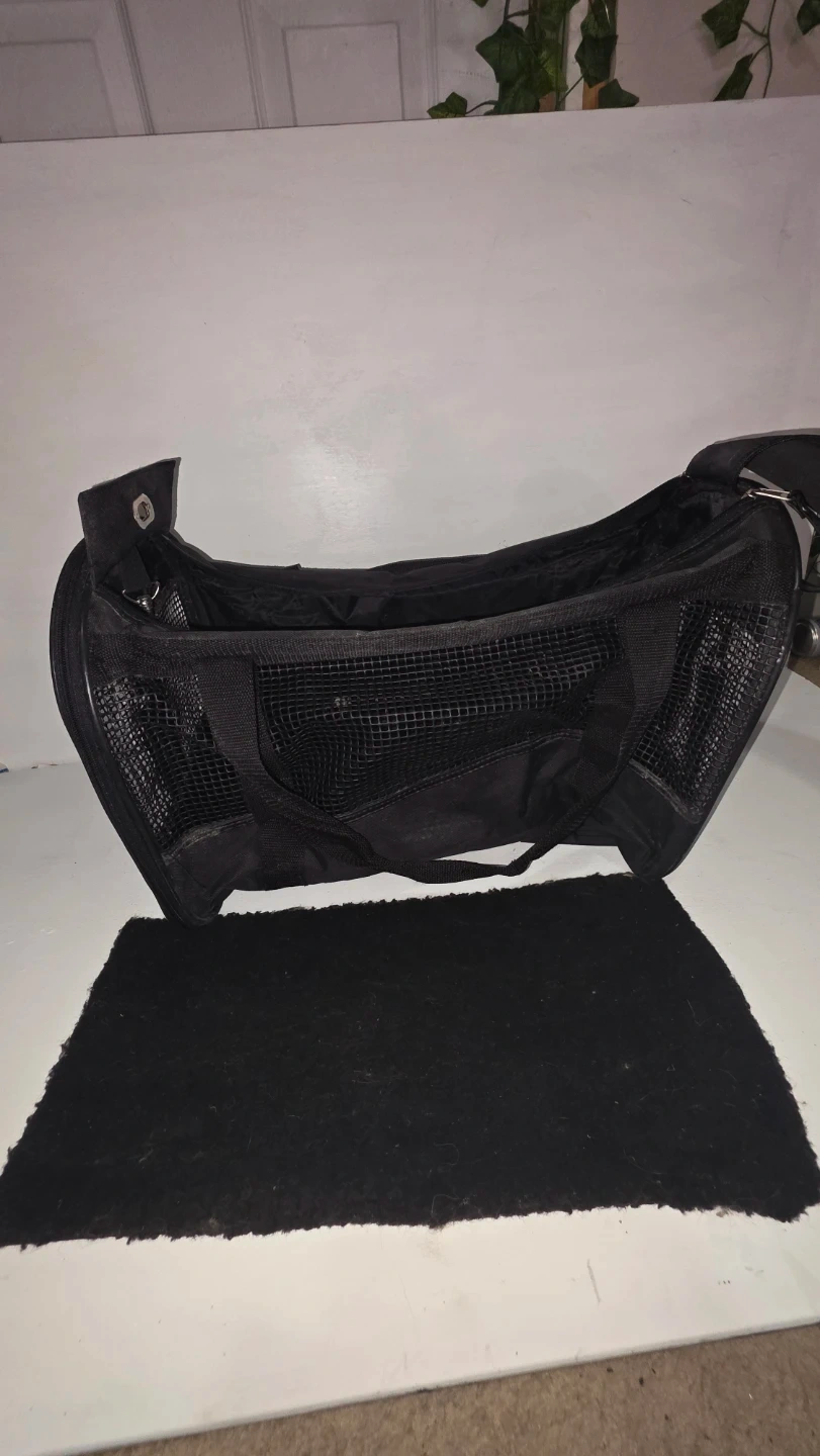 This is a black pet carrier bag, suitable for small animals. It features mesh panels for ventilation on multiple sides. It comes with a removable, washable mat for comfort. Great for travel!