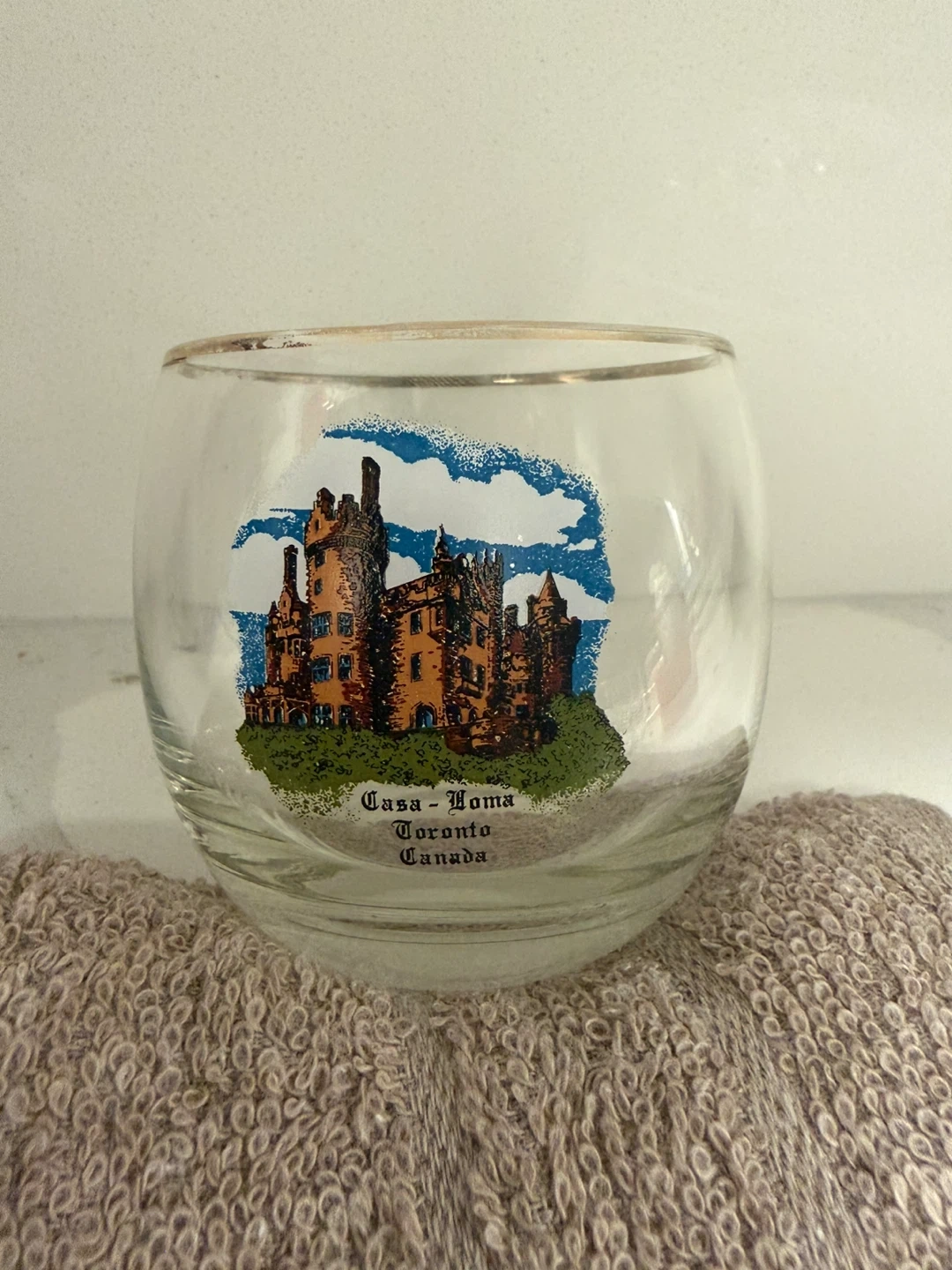 Set of 4 vintage lowball/rolly poly glasses featuring iconic Toronto landmarks: New City Hall, Ontario Place, the Science Centre, and Casa Loma. Some wear on the paint and gold rims of some of the glasses as shown in photos.
