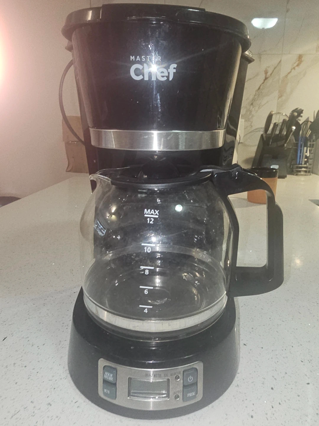 Master Chef 12-cup drip coffee maker with programmable timer. Carafe features measurement markings up to 12 cups. Black exterior with stainless steel accents. Simple to use with a digital display.