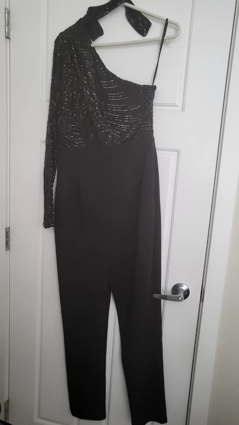 Stylish black jumpsuit with a one-shoulder design featuring sequin detailing on the bodice. This piece offers a chic silhouette perfect for evening wear. It's made from a comfortable fabric with a flattering fit.