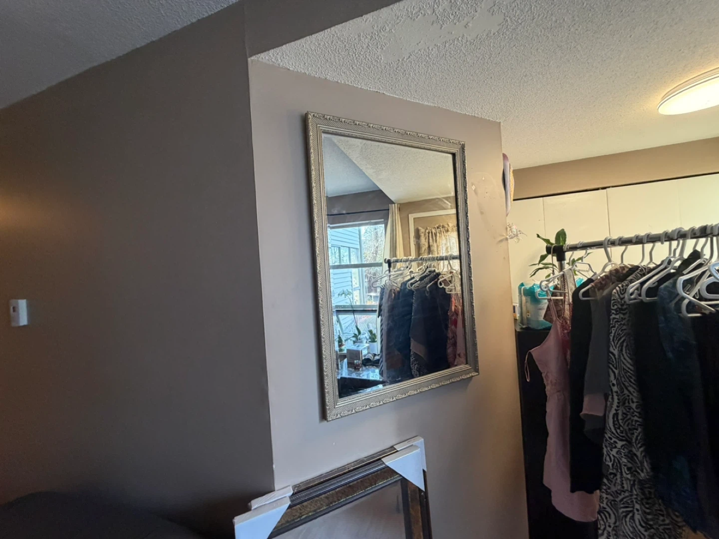 This is a decorative wall mirror with an ornate silver-toned frame. It's perfect for adding a touch of elegance to any room. The mirror itself is clear and reflects well.
