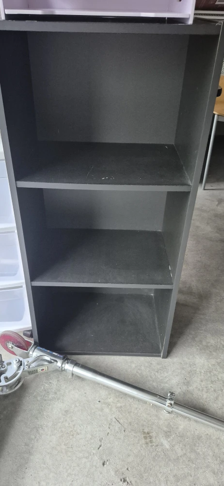 Selling a black bookshelf in good condition. It has some minor wear and tear, but is still very sturdy and functional. Perfect for storing books, decorations, or anything else you need to keep organized