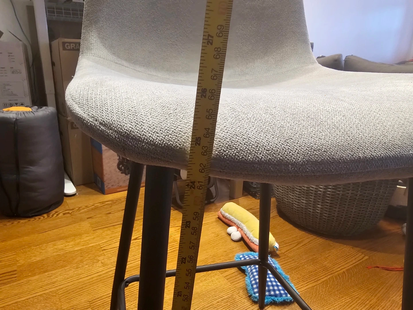 Two grey upholstered bar stools with black metal legs. Seat height measures approximately 26 inches. Perfect for a kitchen island or counter.