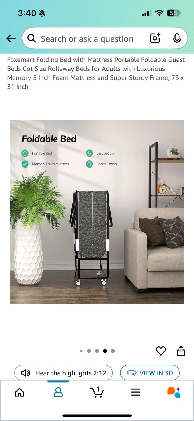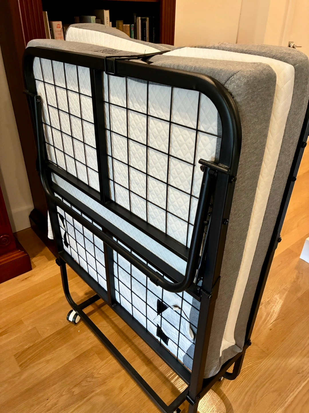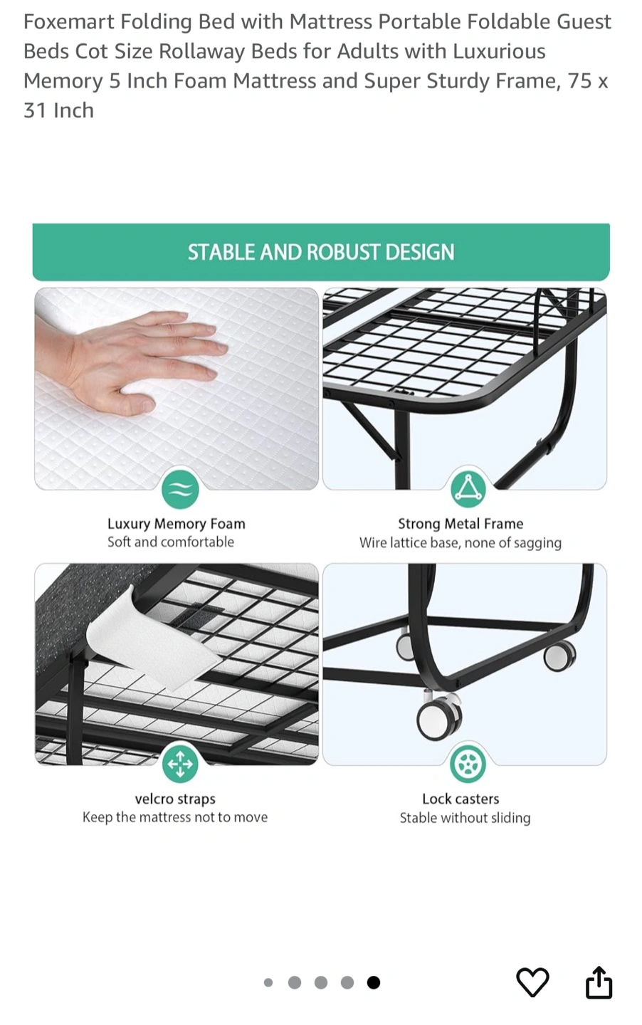 Selling a folding bed (LIKE NEW) perfect as a portable guest bed! It's in great condition - memory foam mattress - and folds up for easy storage. Bought for a guest but used only ONCE and with a topper. Check the pics for the actual like new conditions. Link to site (where I bought it)