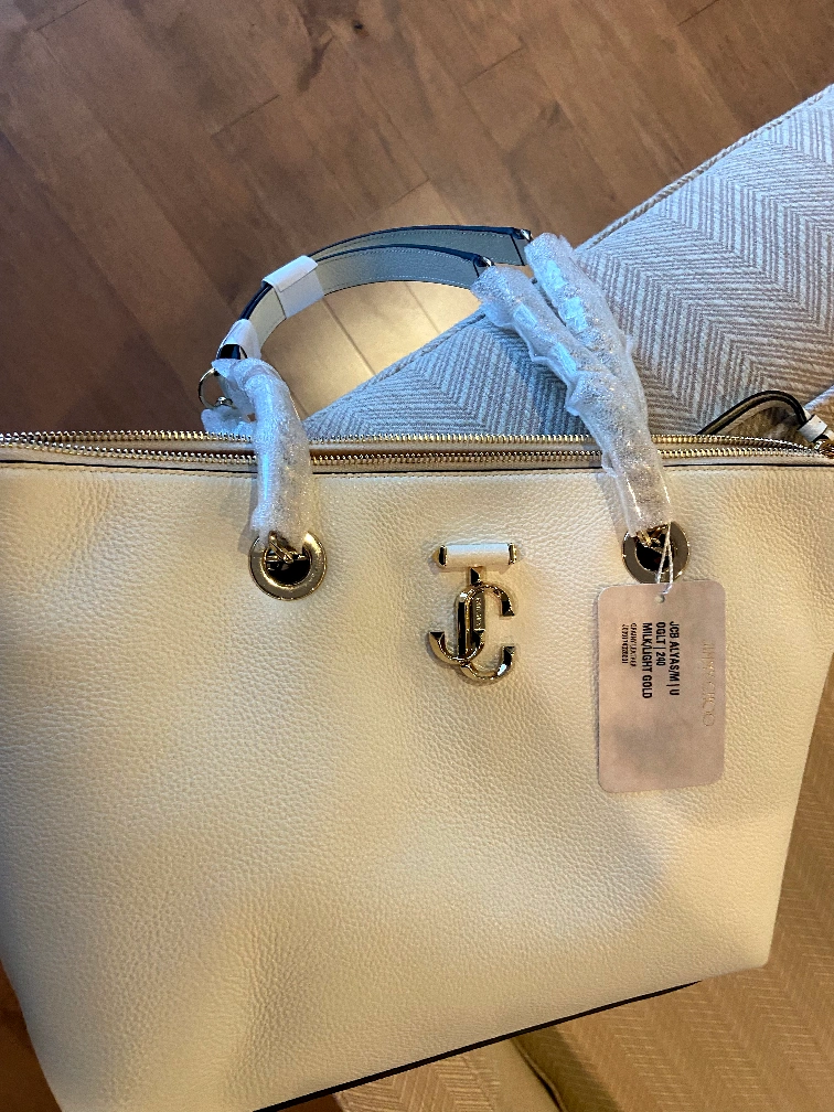 Brand new authentic Jimmy Choo handbag in white textured leather. Features a gold-tone JC logo and zip closure. Includes original tags.
