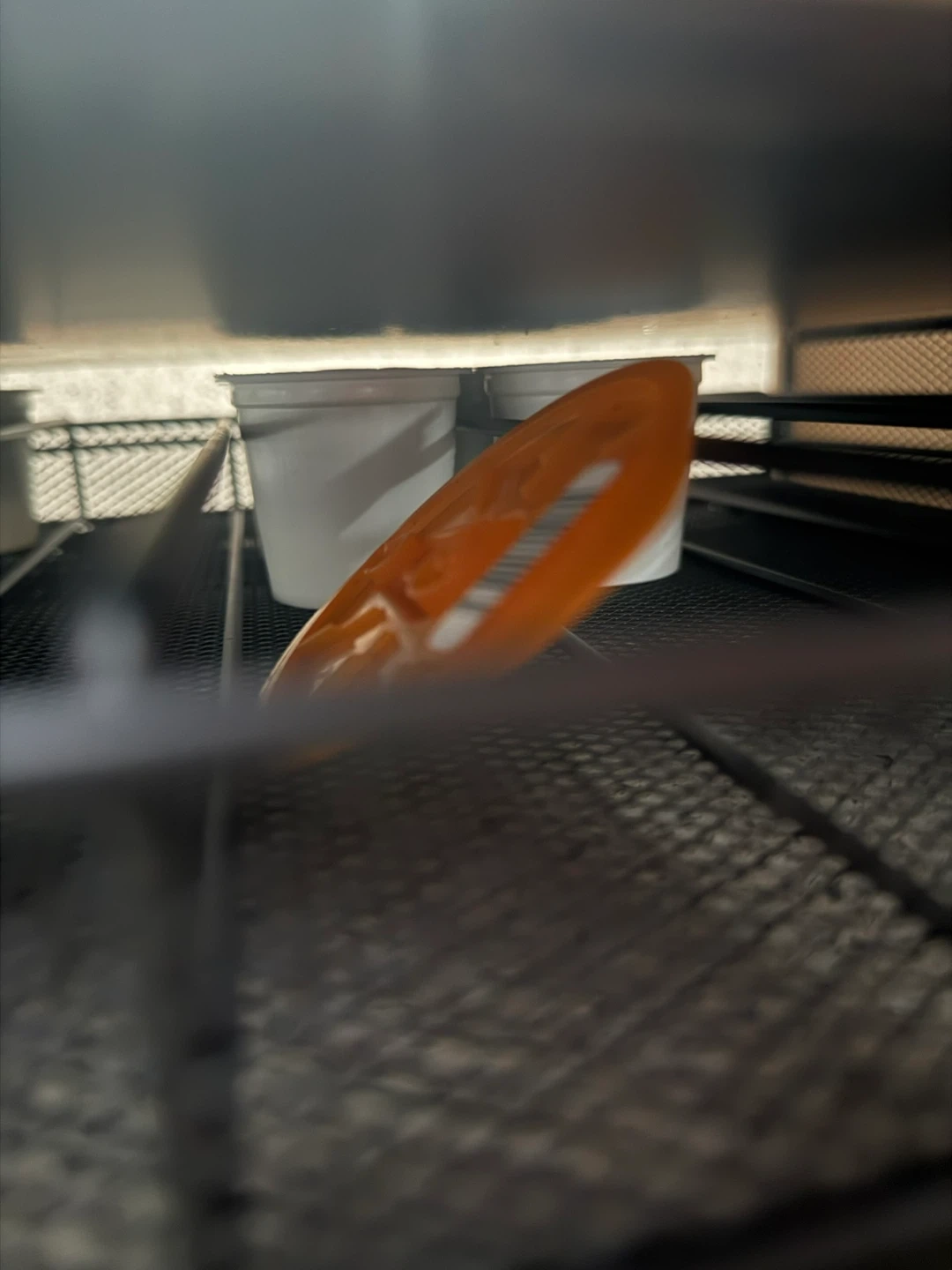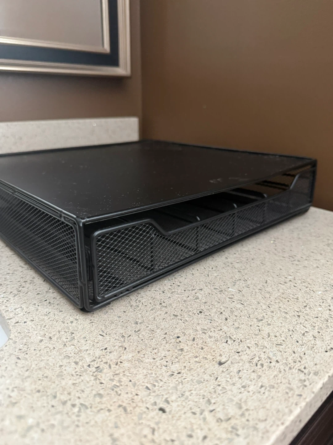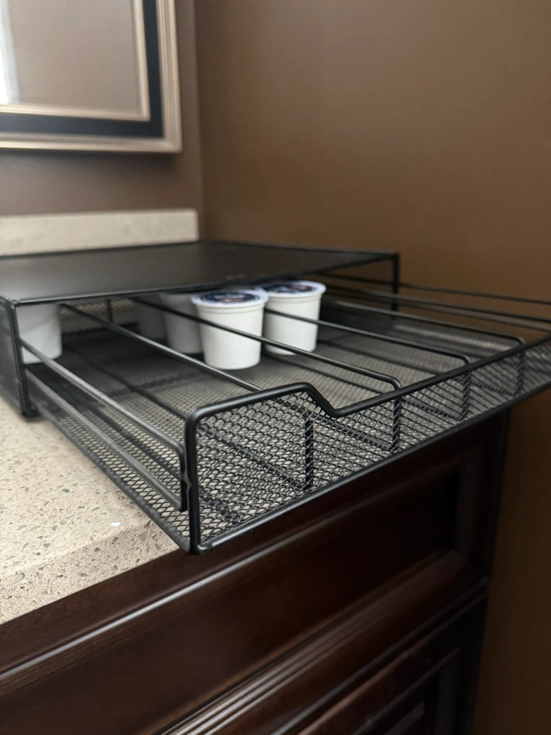 This is a black mesh drawer organizer designed to hold K-Cup coffee pods. It's a convenient way to store and access your coffee pods right by your brewer. It has multiple drawers for easy organization.