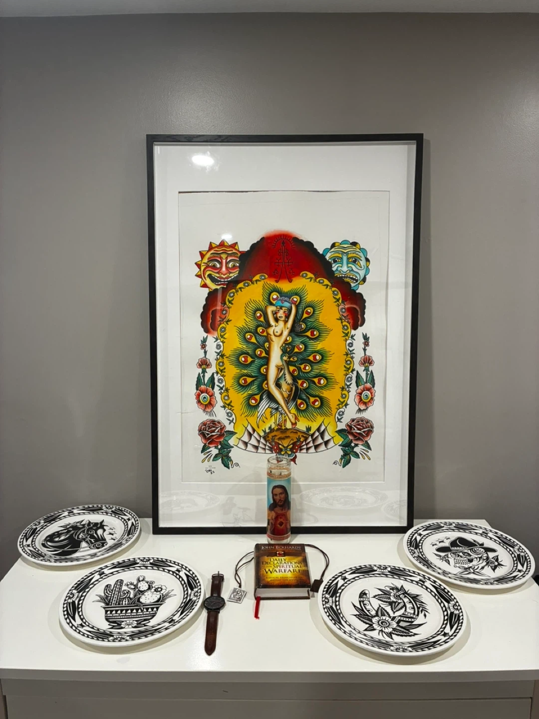 This framed print showcases vibrant tattoo-style artwork featuring a woman and a peacock. It's surrounded by decorative elements like sun faces, roses, and butterflies. The art is presented in a simple black frame. This piece would add a unique aesthetic to any space.