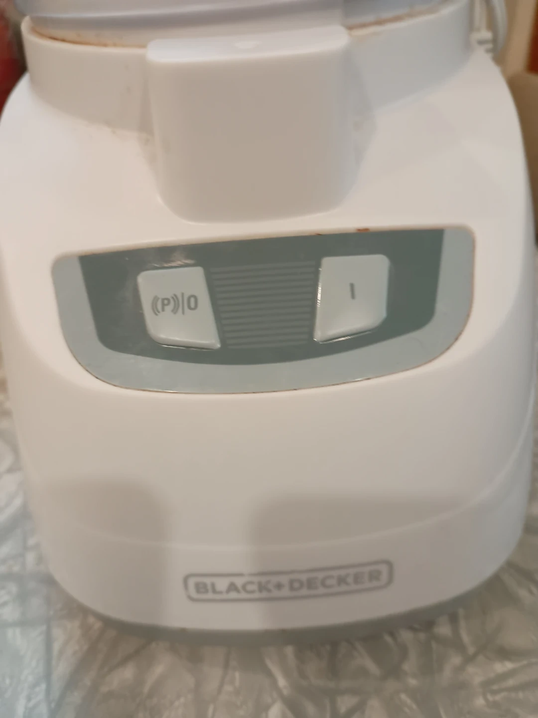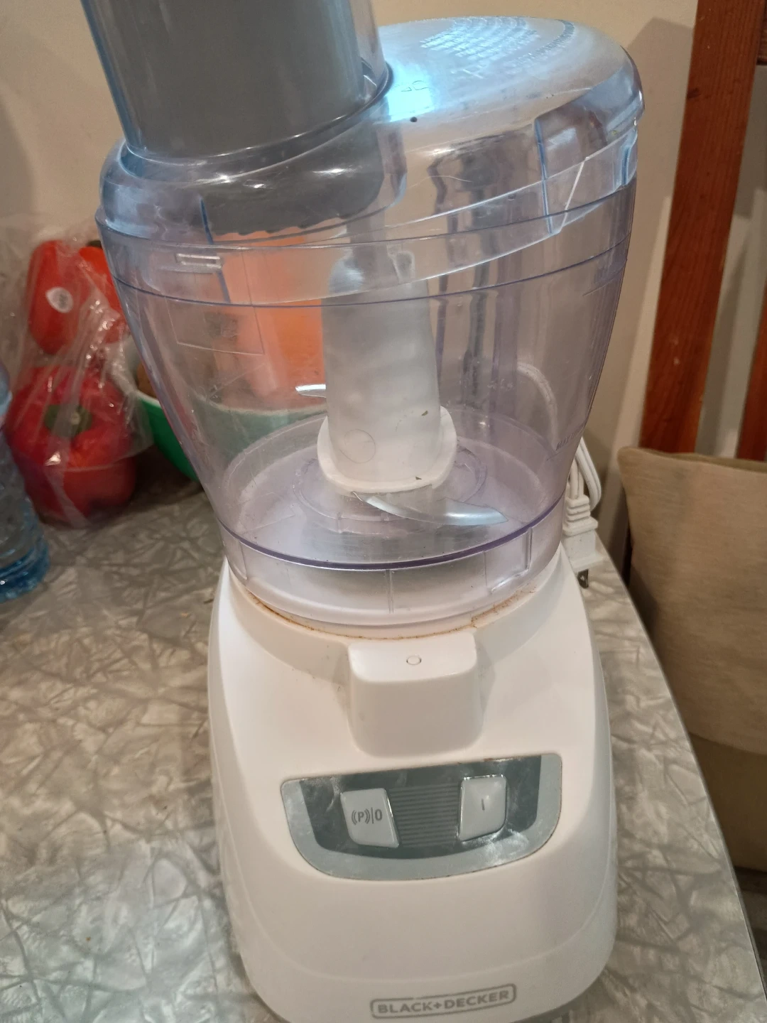 This is a white BLACK+DECKER food processor. It has two speed settings: 'P' (pulse) and '1' (low). Great for chopping and pureeing ingredients quickly!