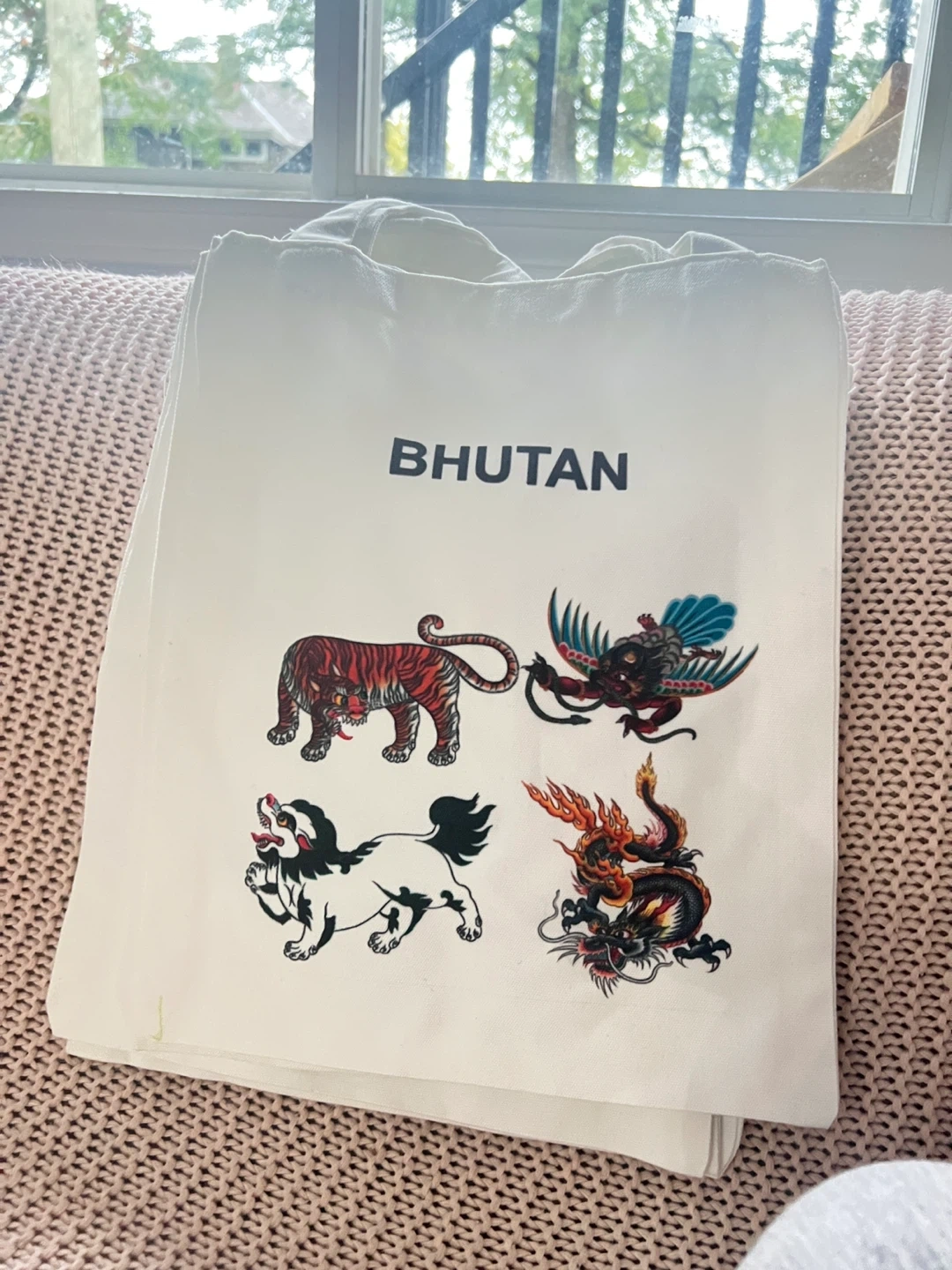 Selling white cotton tote bags featuring Bhutanese designs. They're perfect for everyday use, or as a souvenir! Each bag has a convenient front pocket.