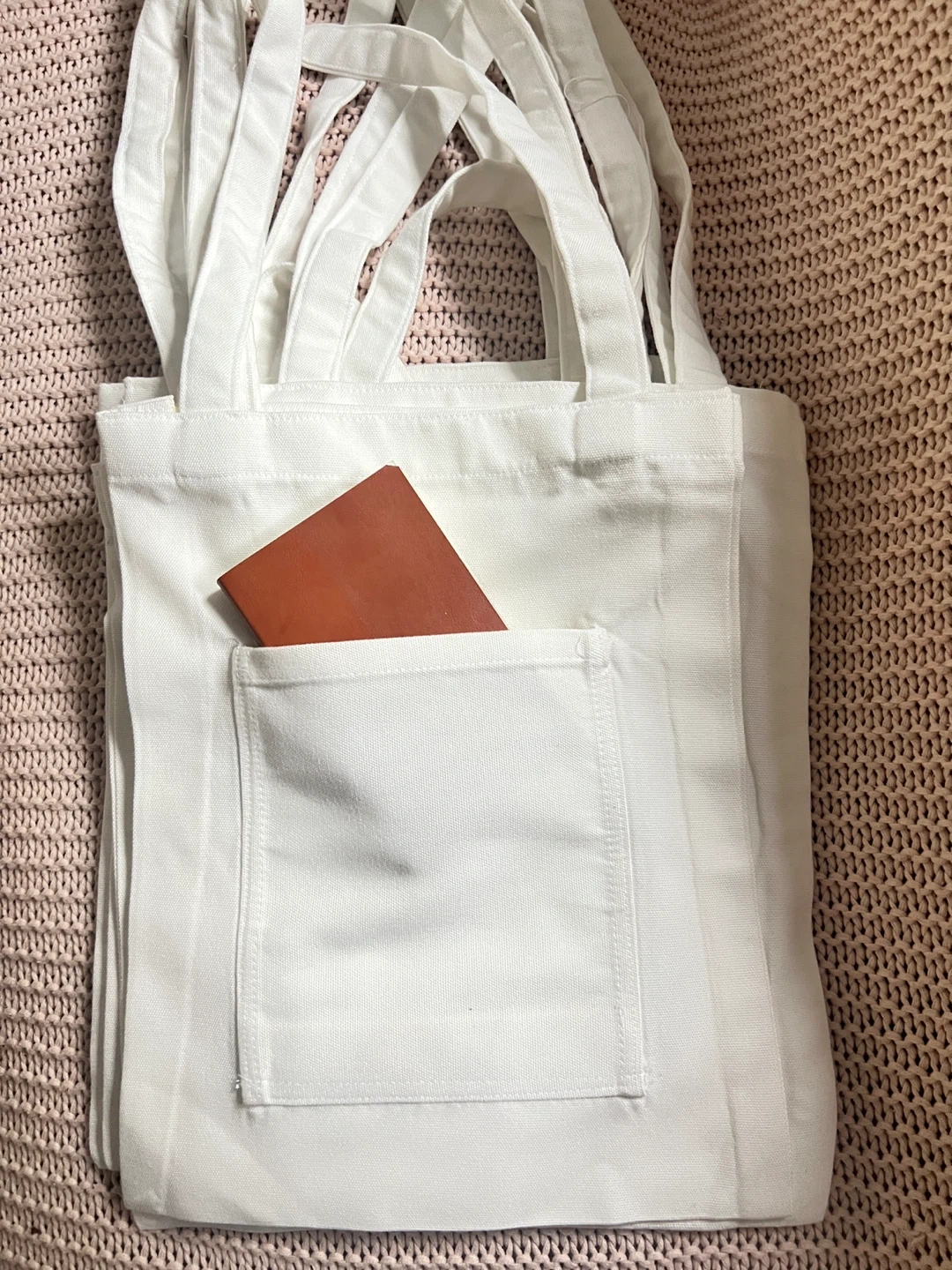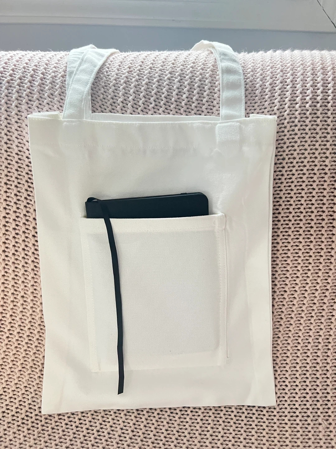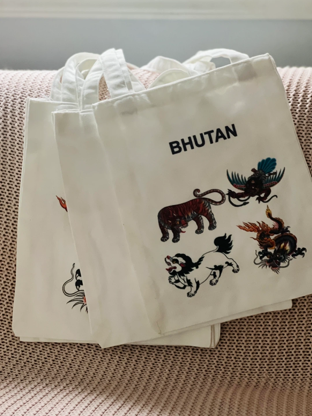 Selling white cotton tote bags featuring Bhutanese designs. They're perfect for everyday use, or as a souvenir! Each bag has a convenient front pocket.