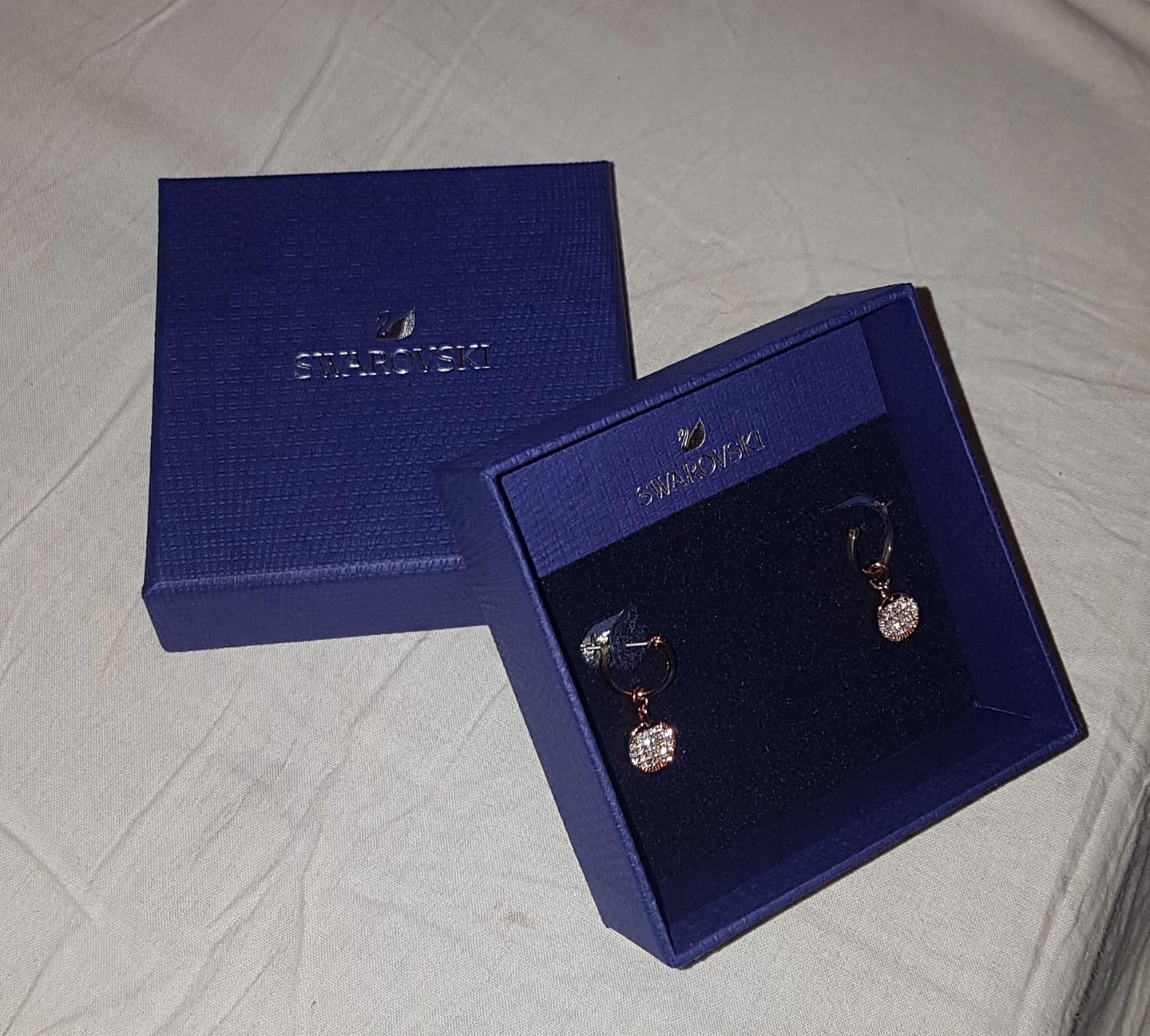 Selling a beautiful Swarovski set, including a pair of earrings and a necklace. The set is rose gold in colour and comes with the original box. Perfect for a gift or to treat yourself!