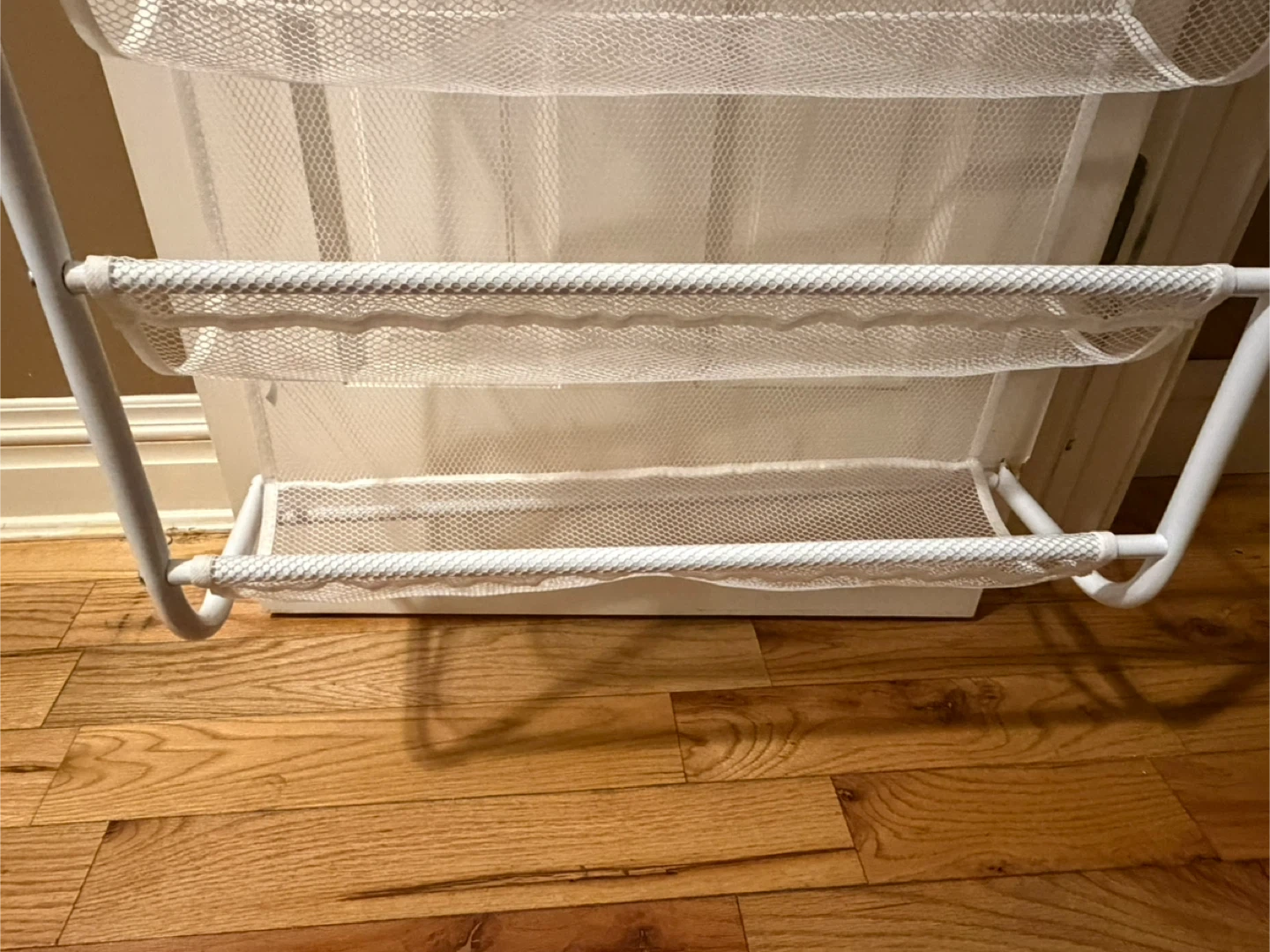 Handy over-the-door hanging organizer. It's perfect for adding extra storage space in your closet, bathroom, or any room where you need a little more organization. The white color is neutral and will fit in with any decor. It features multiple tiers of mesh pockets, so you can easily see and access your items.