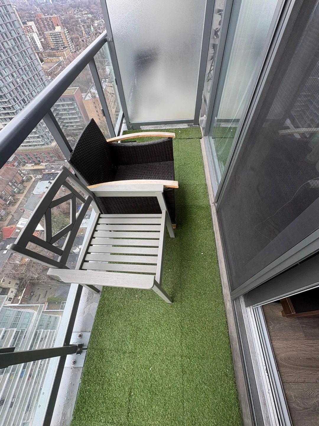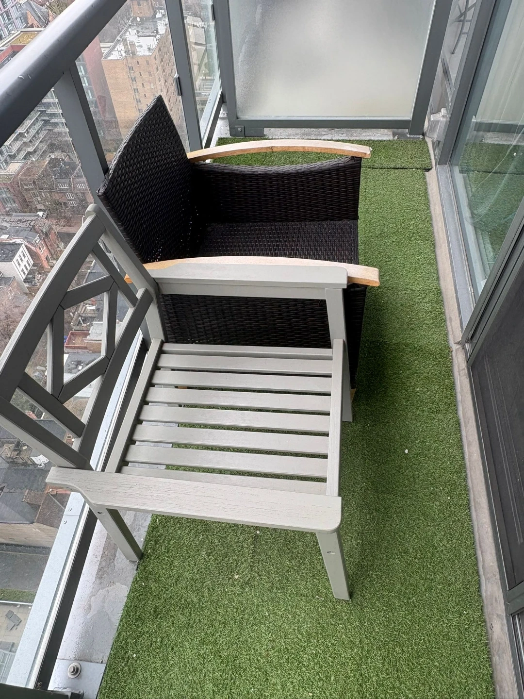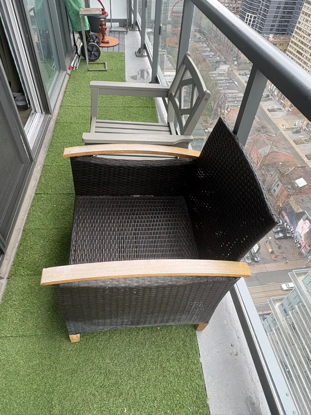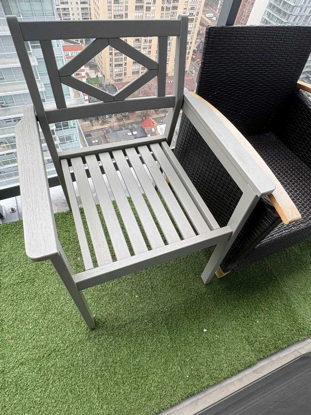 Set of two chairs, one black woven outdoor chair with wood accents and one grey wooden chair. Perfect for a balcony or patio space.