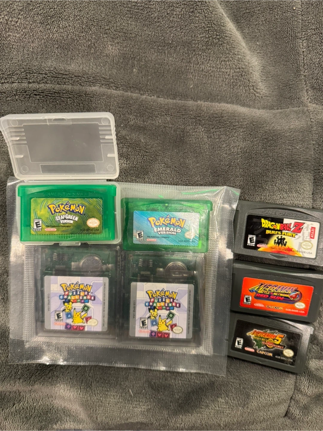 Gameboy game lot includes Pokemon emerald and 2 copies of puzzle challenge , dragon ball z buu’s fury and megaman 4&5
