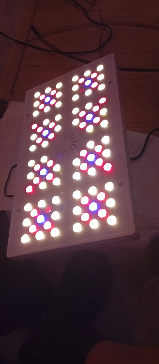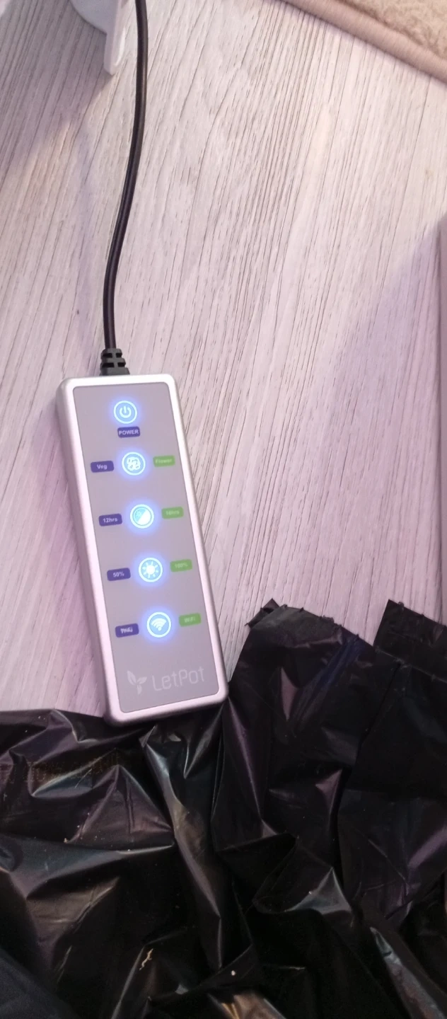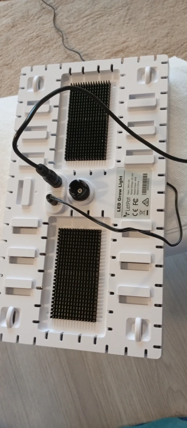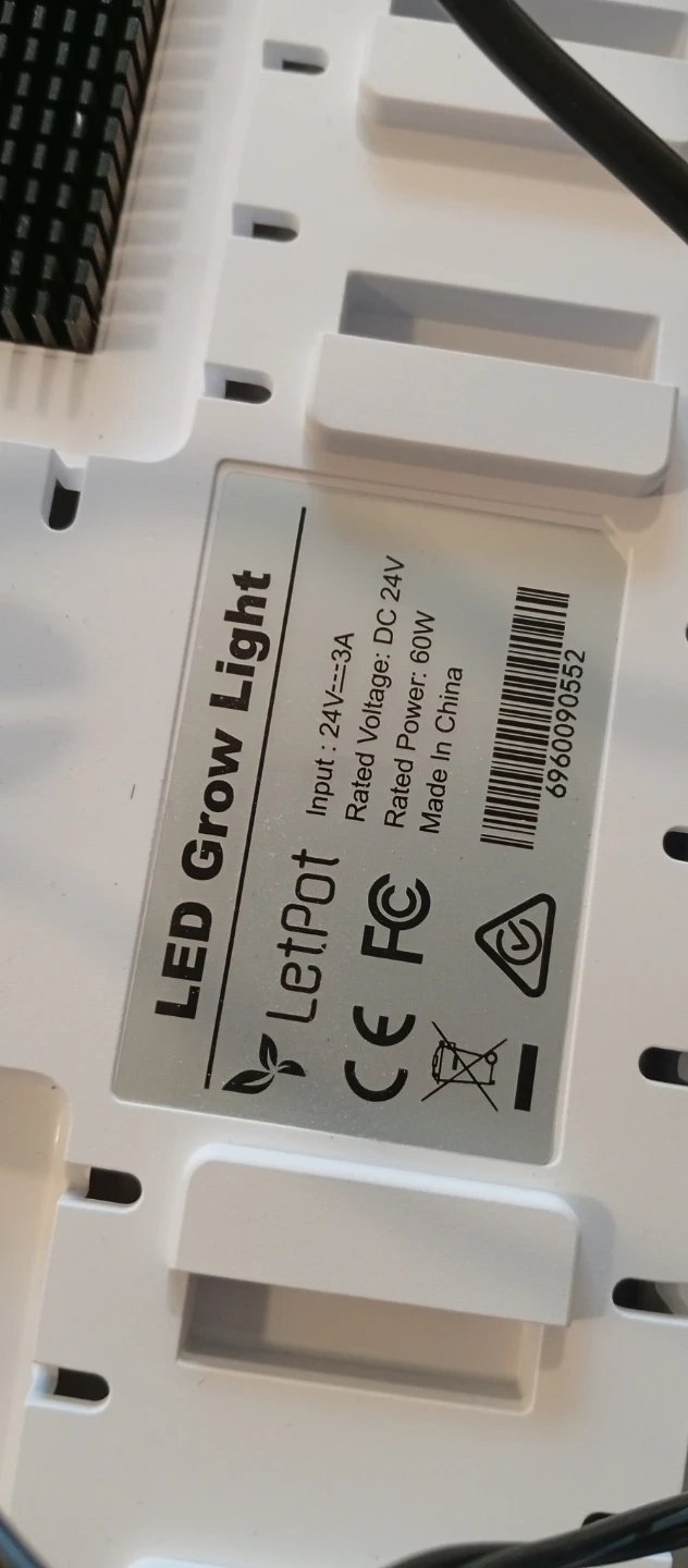 This is a LetPot LED grow light. It's rated for 60W with an input voltage of 24V DC. The unit features a timer and dimming functions for customizable lighting.