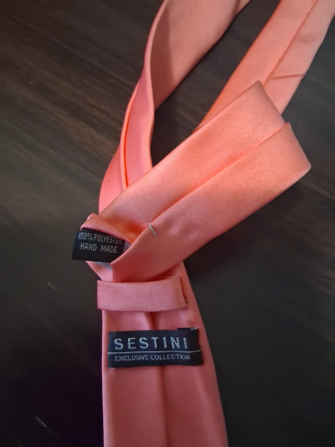 A Sestini Exclusive Collection tie in a lovely peach colour. It's made of 100% polyester and is hand-made. This tie would be suitable for special occasions or to add a touch of colour to formal wear.