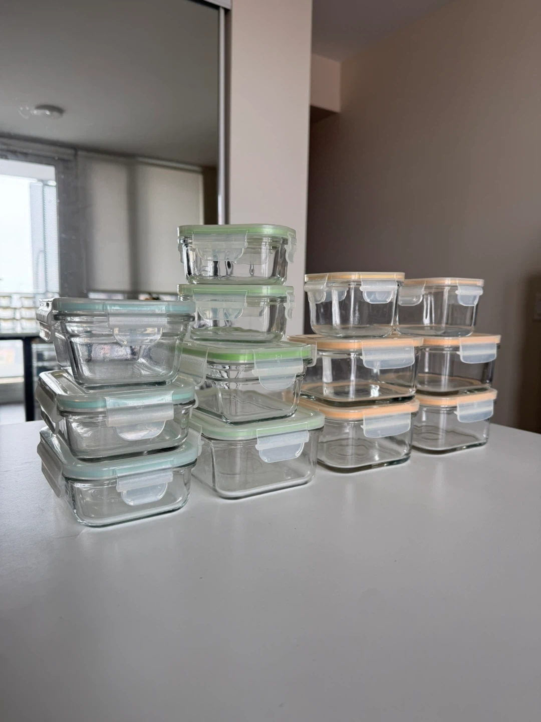 Set of glass food storage containers with colourful lock lids. Various sizes included for meal prep or leftovers. Dishwasher safe for easy cleaning. These are great for storing anything from salads to soups!