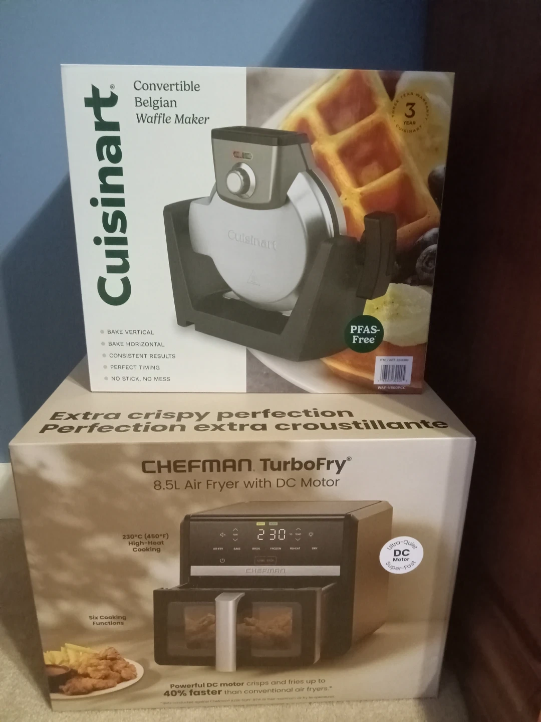 Selling a Cuisinart Convertible Belgian Waffle Maker and a Chefman TurboFry 8.5L Air Fryer. The waffle maker offers vertical and horizontal baking with non-stick plates. The air fryer features a DC motor for fast cooking and six functions, reaching up to 450°F. Both are in their original boxes.