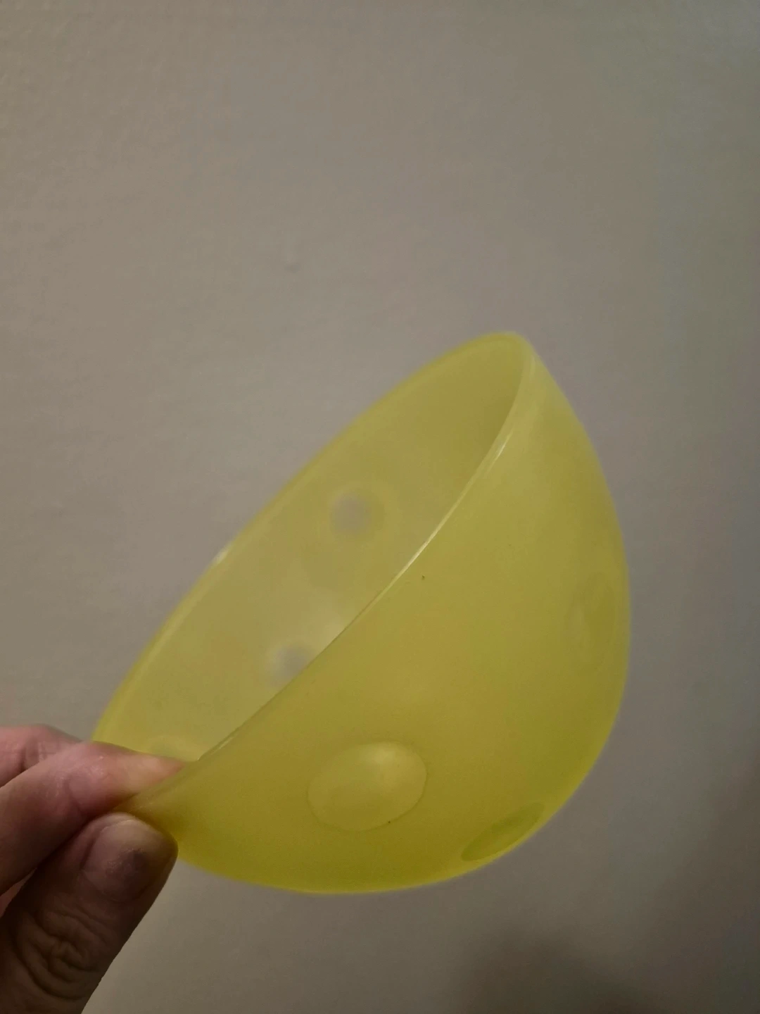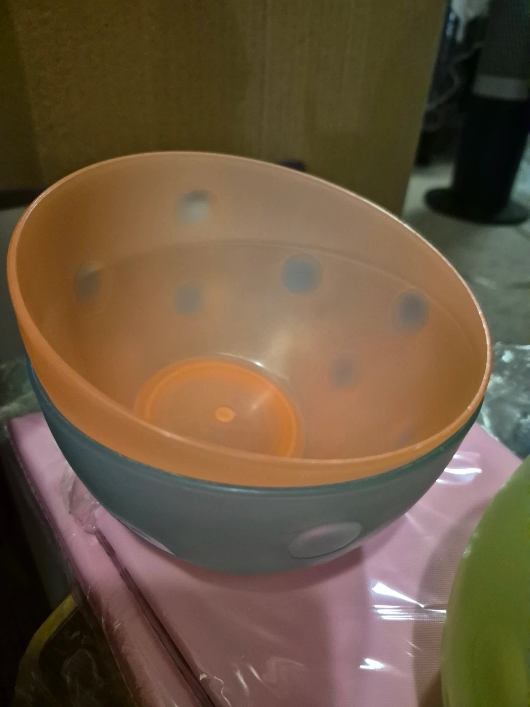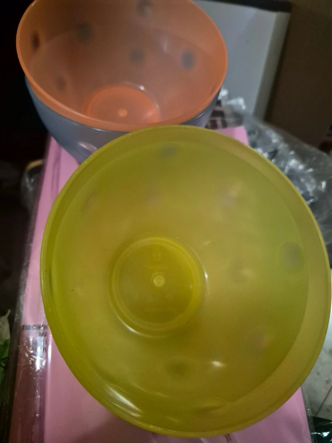 Set of two plastic serving bowls. One is orange and grey, the other is yellow. They're perfect for snacks or side dishes. These bowls are lightweight and easy to clean.