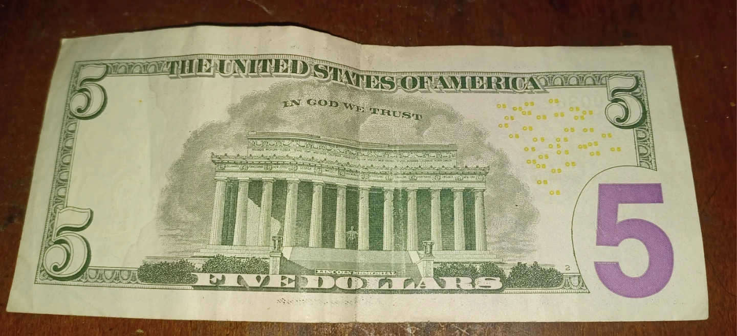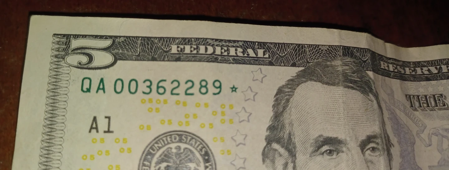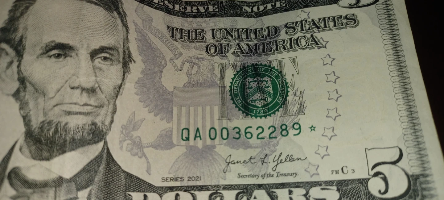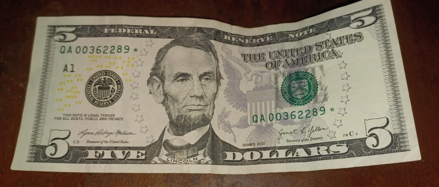 This is a genuine United States $5 bill featuring Abraham Lincoln on the obverse and the Lincoln Memorial on the reverse. It's a Federal Reserve Star Note from the Series of 2021. A standard denomination for everyday transactions!