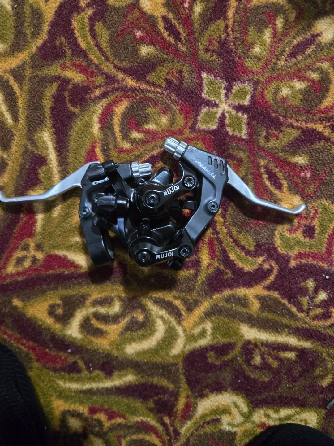 This set includes RUJOI disc brake levers and calipers for a bicycle. They are made of aluminum alloy for durability. This is a great set for upgrading your bike's braking system.