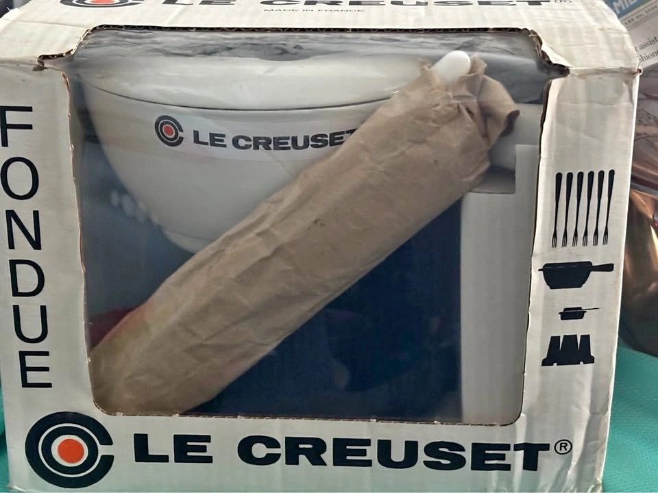 Brand new in box, never used vintage Le Creuset enameled cast iron Fondue set with 6 forks. Pick up in Keswick. Willing to deliver anywhere in Georgina, Newmarket and Aurora.