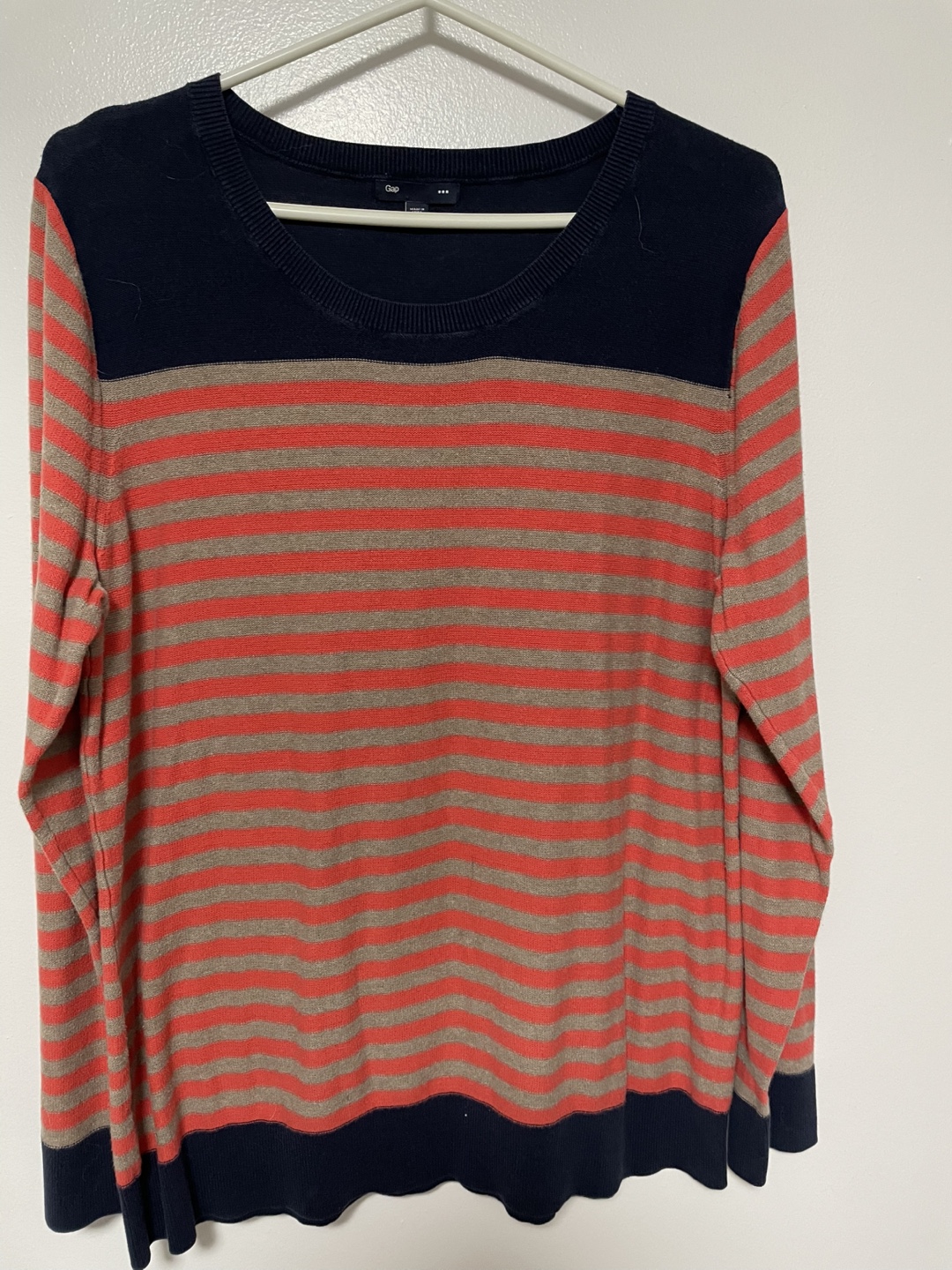 Long-sleeved GAP sweater with horizontal stripes. Navy blue at the top and bottom, with orange and grey stripes in the middle. Very soft!