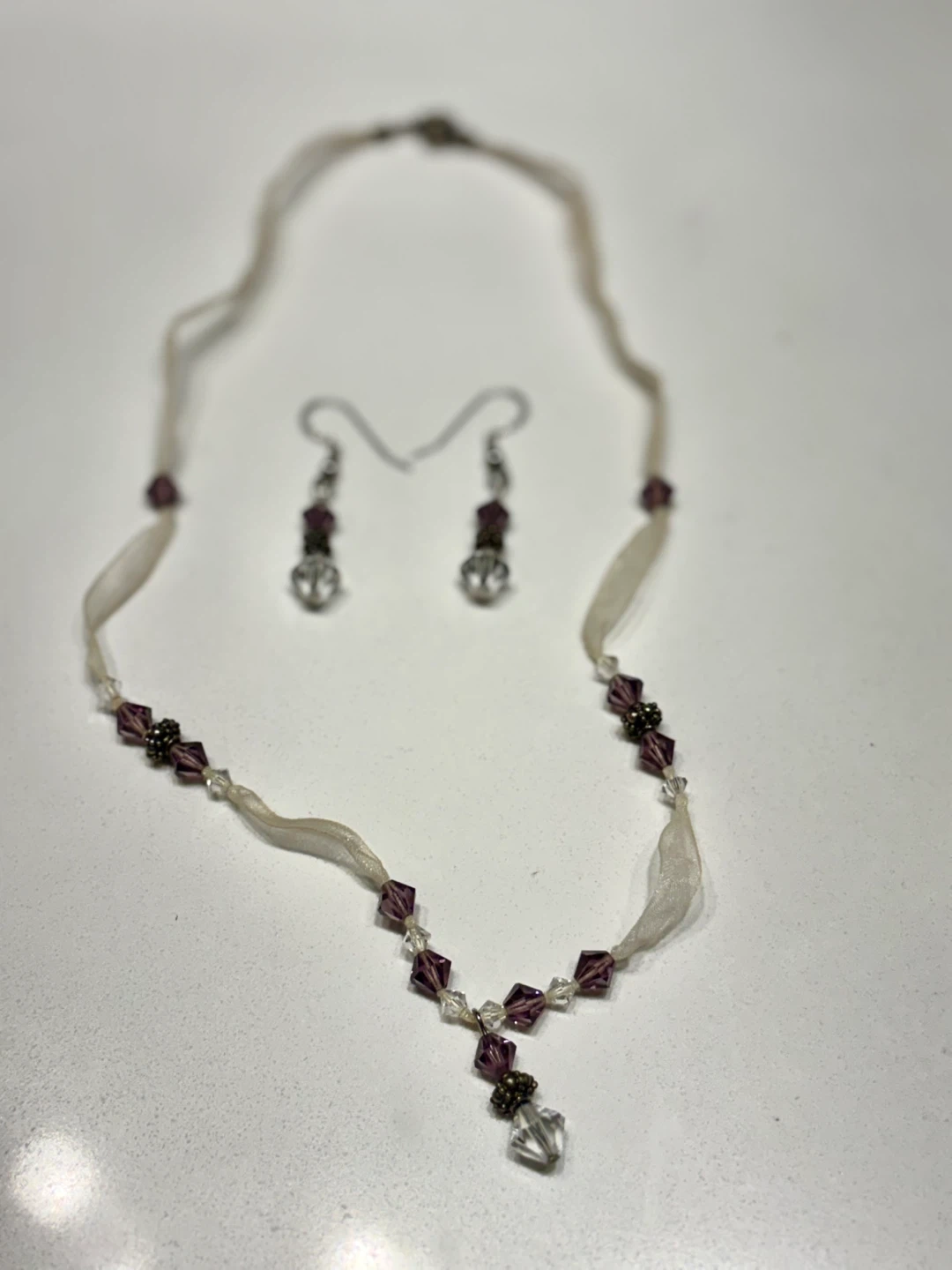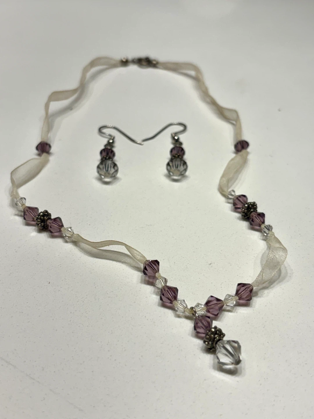 This is a lovely Swarovski crystal necklace and matching earring set. The necklace features clear and purple and clear crystals with a delicate ribbon strand. It includes a decorative drawstring pouch for storage. This set's simple elegance makes it a nice addition for any casual or dressy occasion!