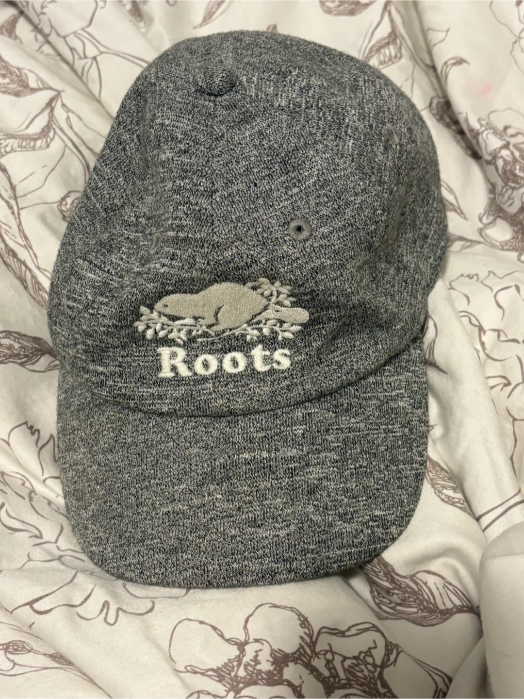 This is a grey Roots baseball cap. It features the classic Roots logo embroidered on the front. Made from a soft, heathered fabric.