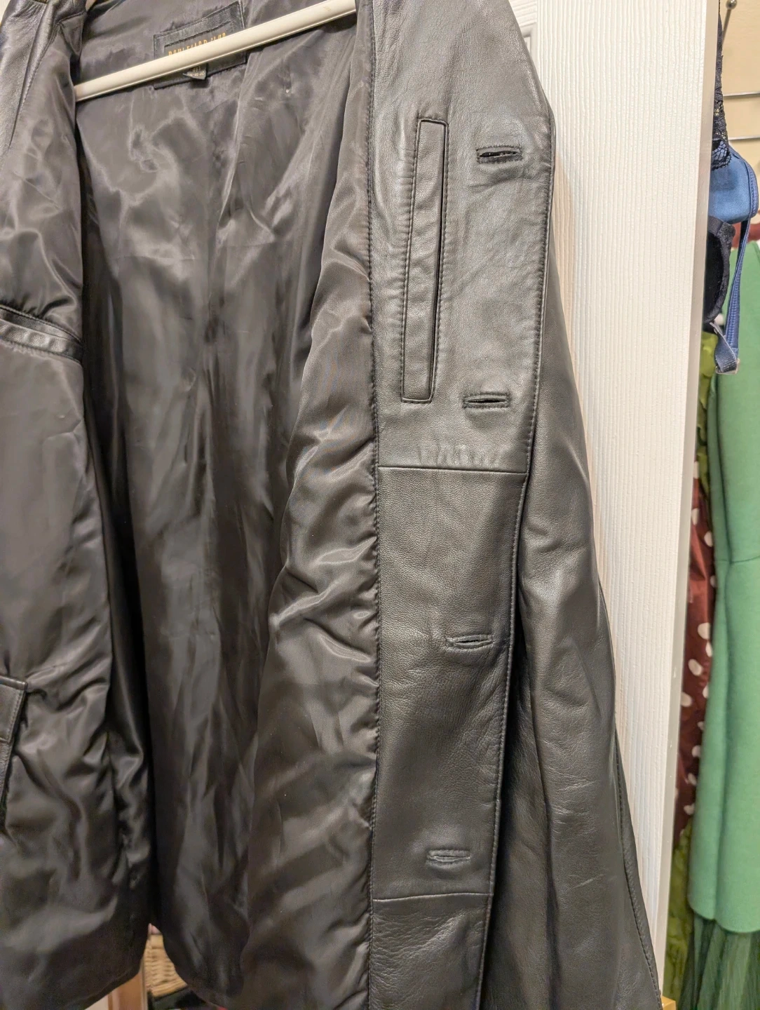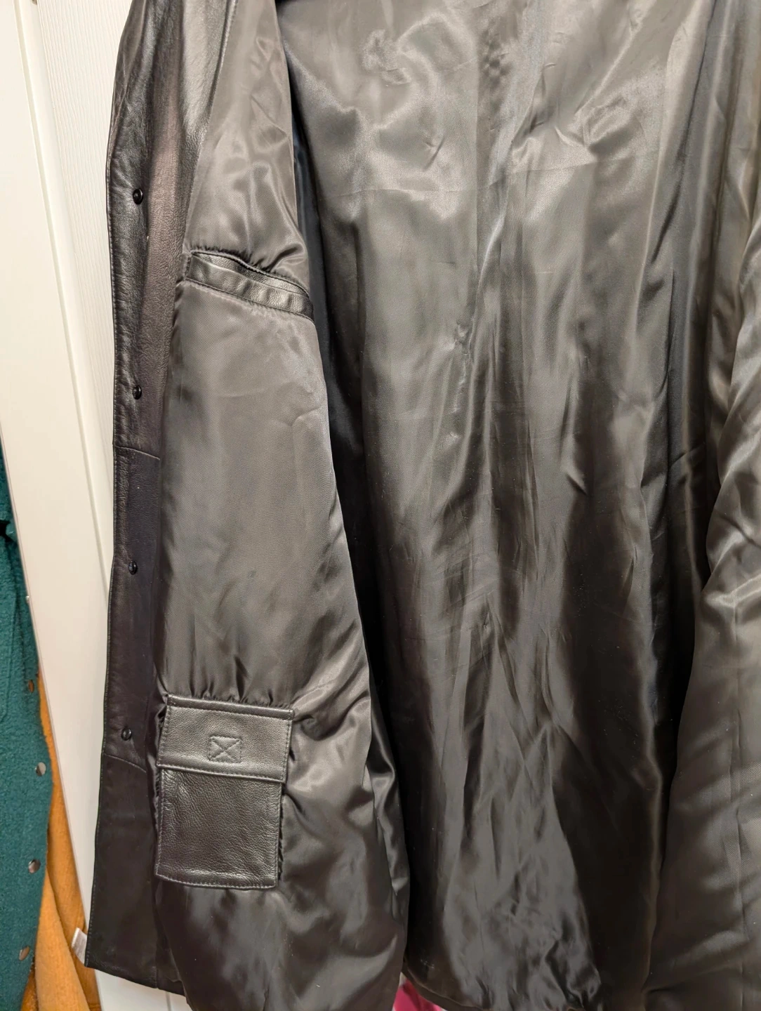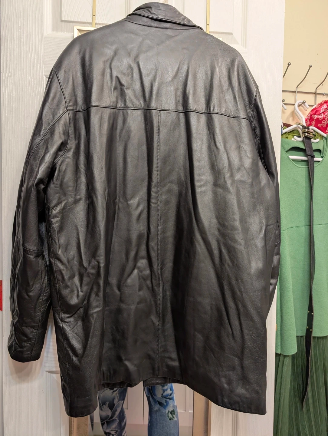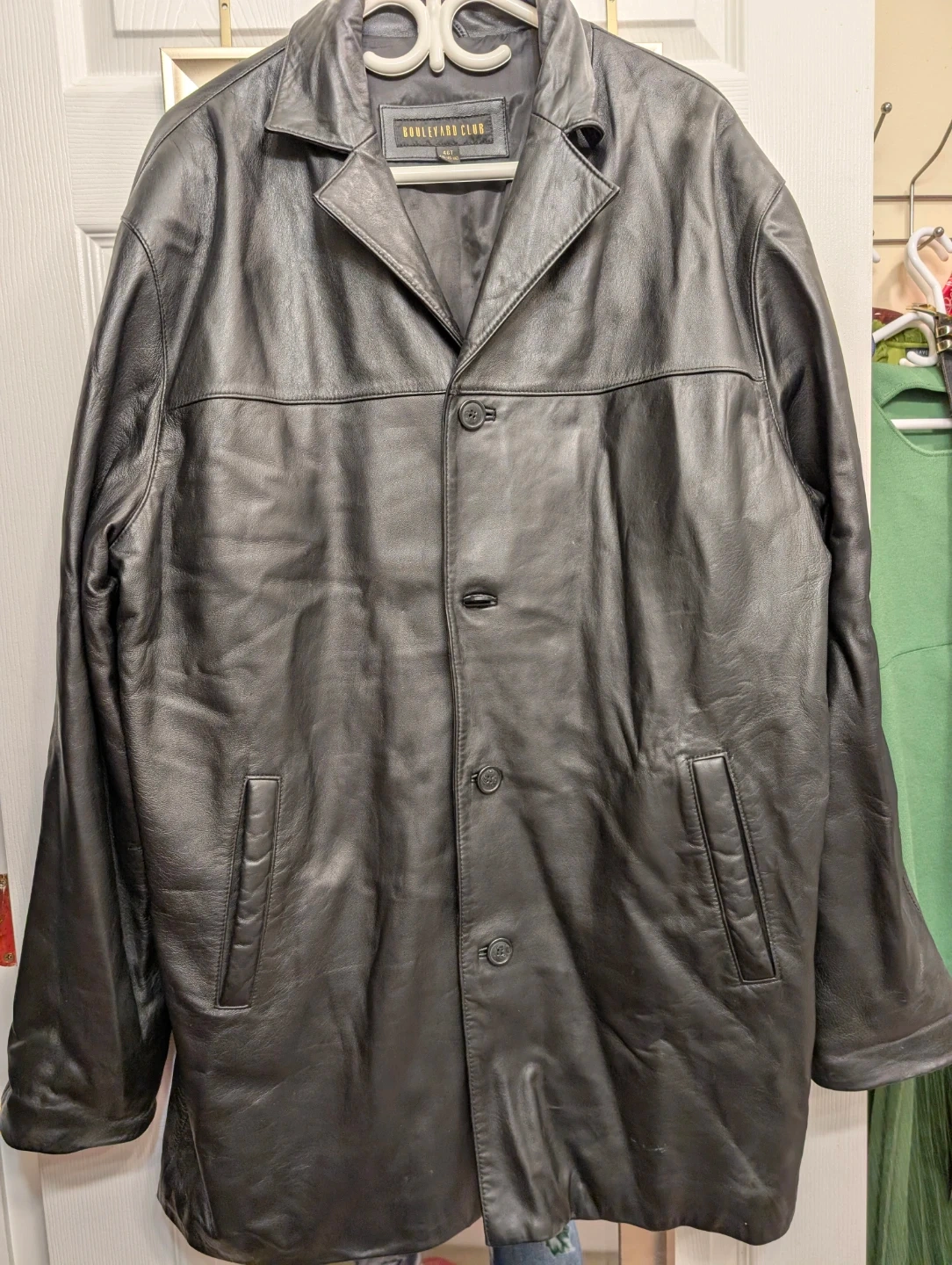 This is a black leather jacket from Boulevard Club. It's a size 46T - XL. The jacket is made of genuine leather and has a smooth satin lining inside. In good condition