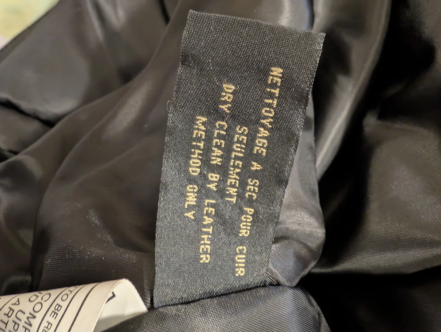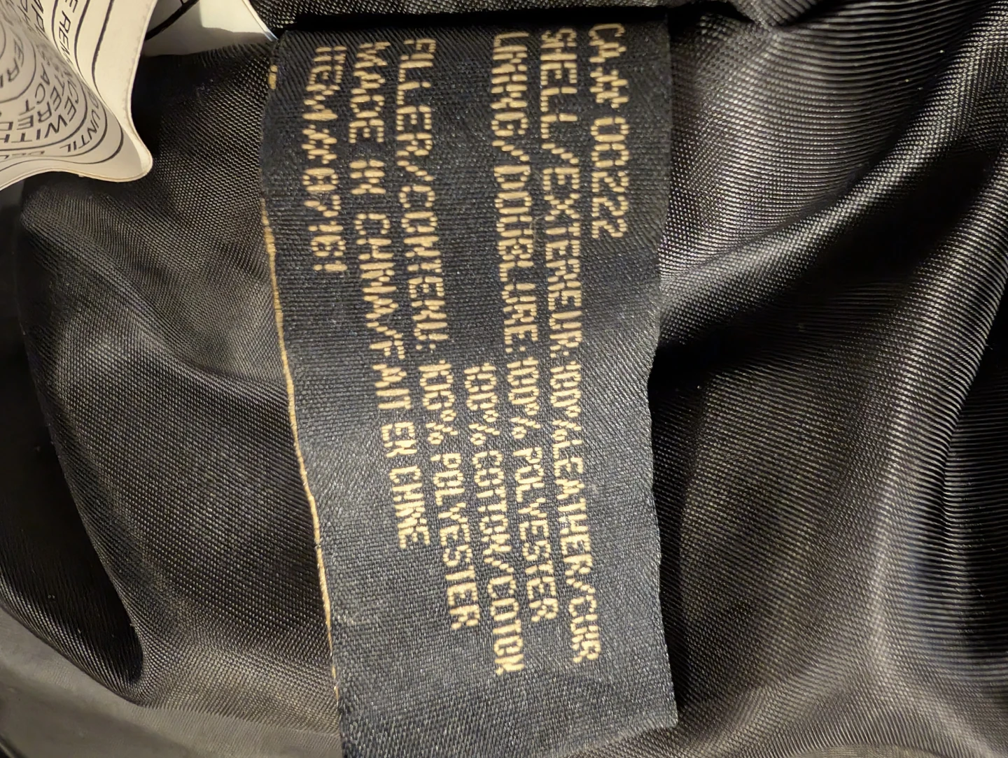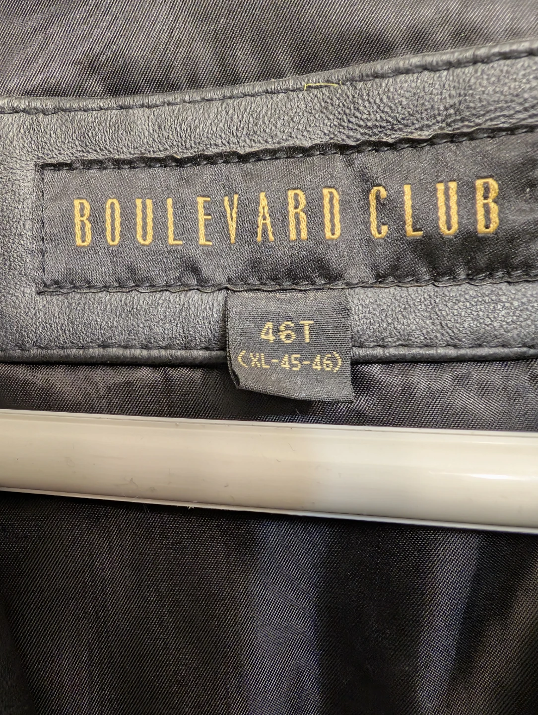 This is a black leather jacket from Boulevard Club. It's a size 46T - XL. The jacket is made of genuine leather and has a smooth satin lining inside. In good condition