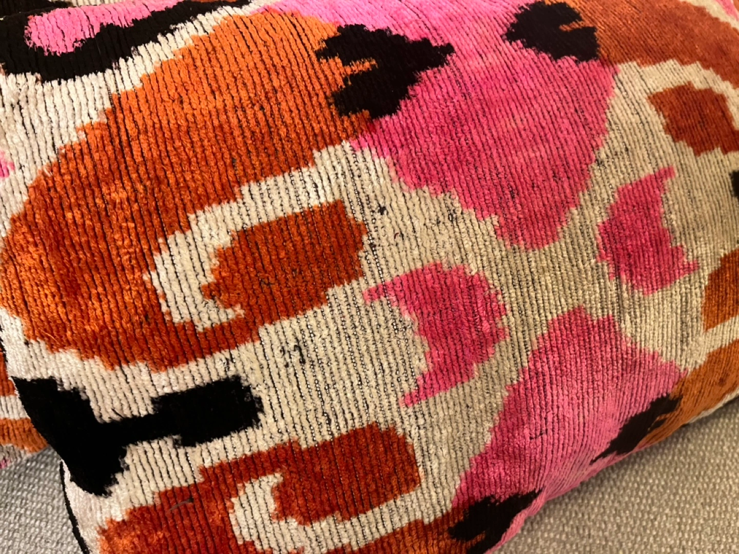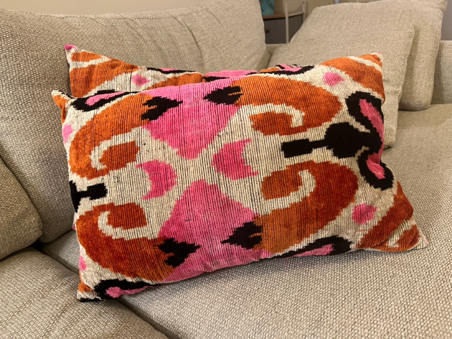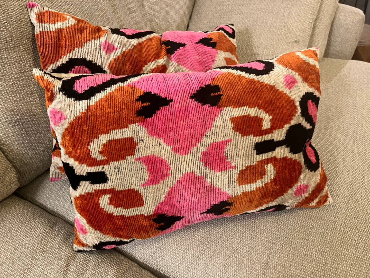 Two rectangular pillows. Pink, orange, and black ikat pattern. Velvet material. Adds a pop of color to any room.