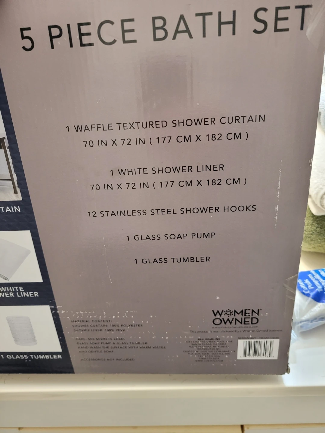 This 5 piece bath set includes a waffle textured shower curtain (70" x 72"), a white shower liner (70" x 72"), 12 stainless steel shower hooks, a glass soap pump, and a glass tumbler. Curtain made from 60% polyester and shower liner is 100% PEVA.