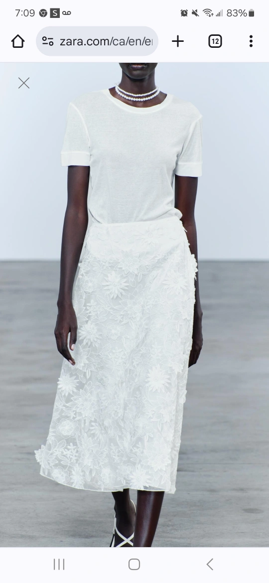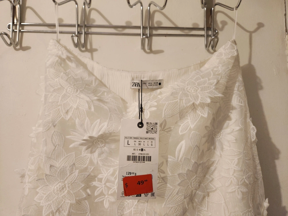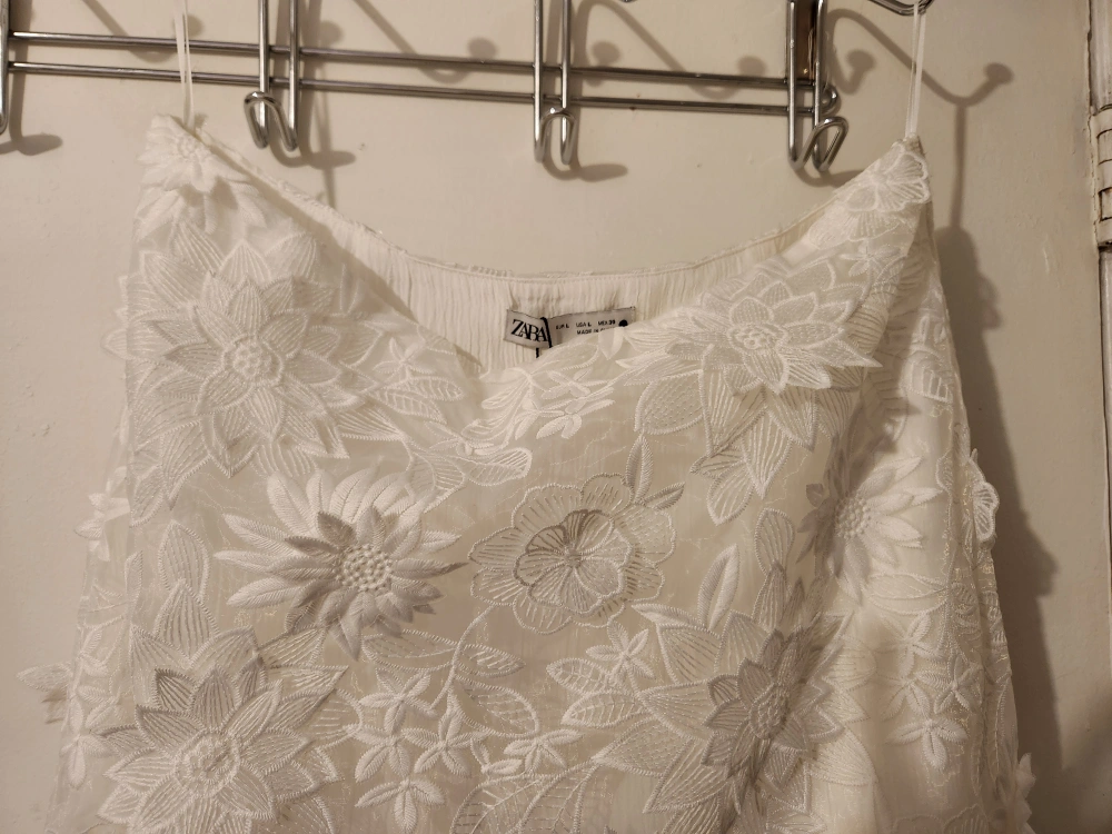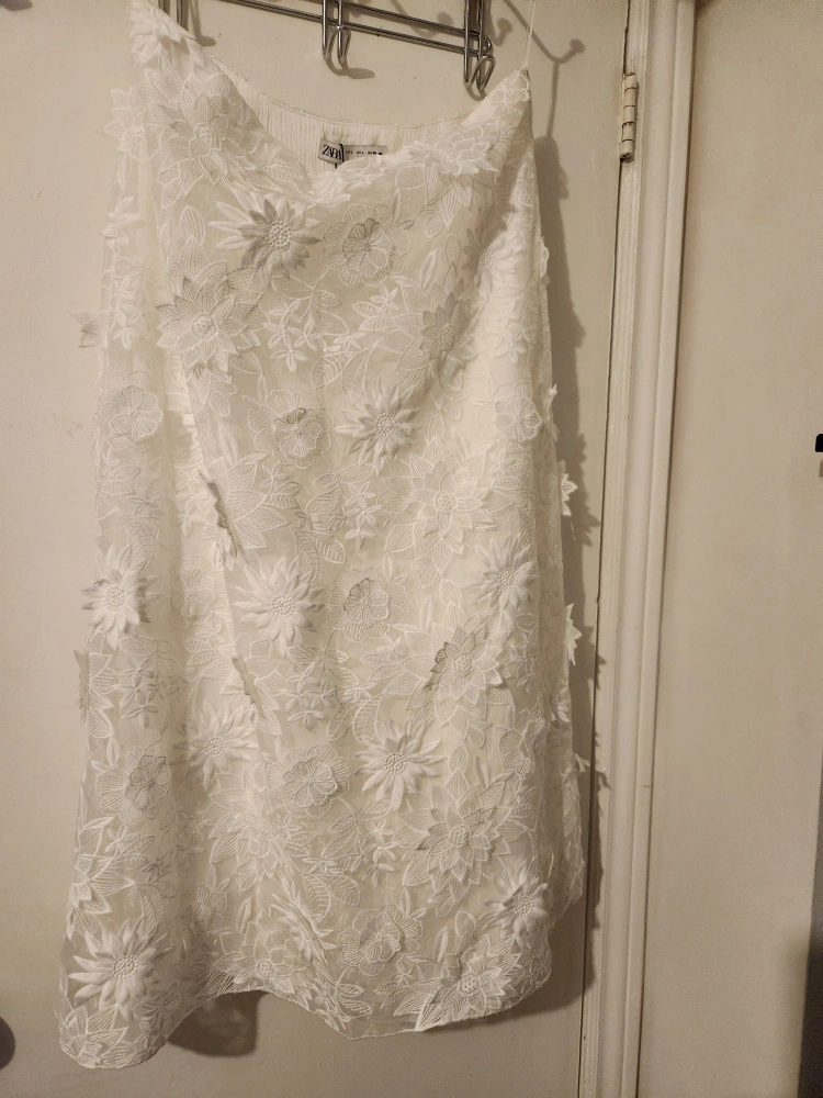 White floral skirt with a sheer fabric and 3D floral details. Size Large. Inside is lined. cash only. price is firm