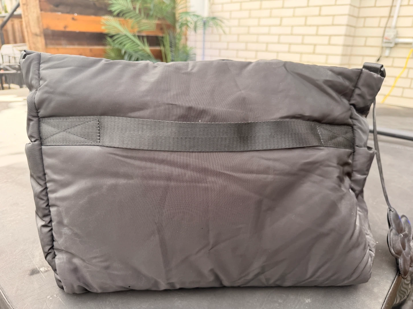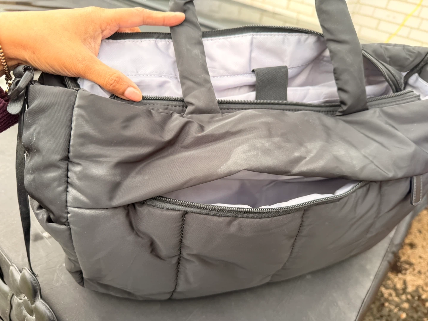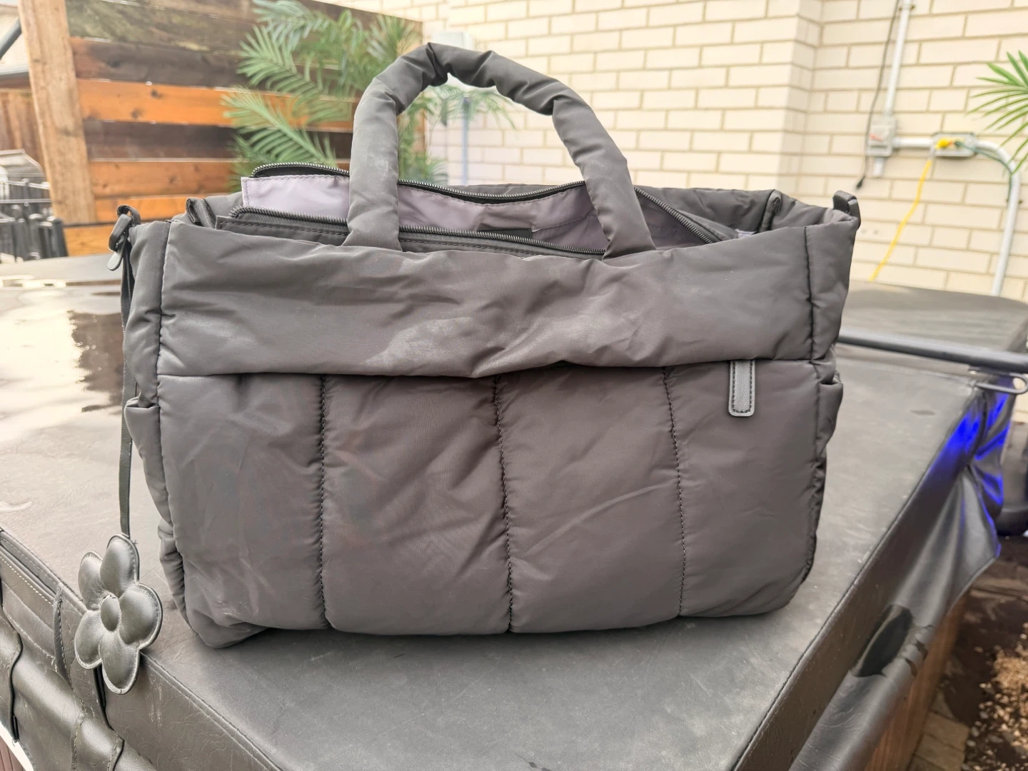 Stylish black puffer tote bag with a padded interior. Features multiple pockets and a dedicated sleeve for a laptop or tablet. Great for everyday use or travel!