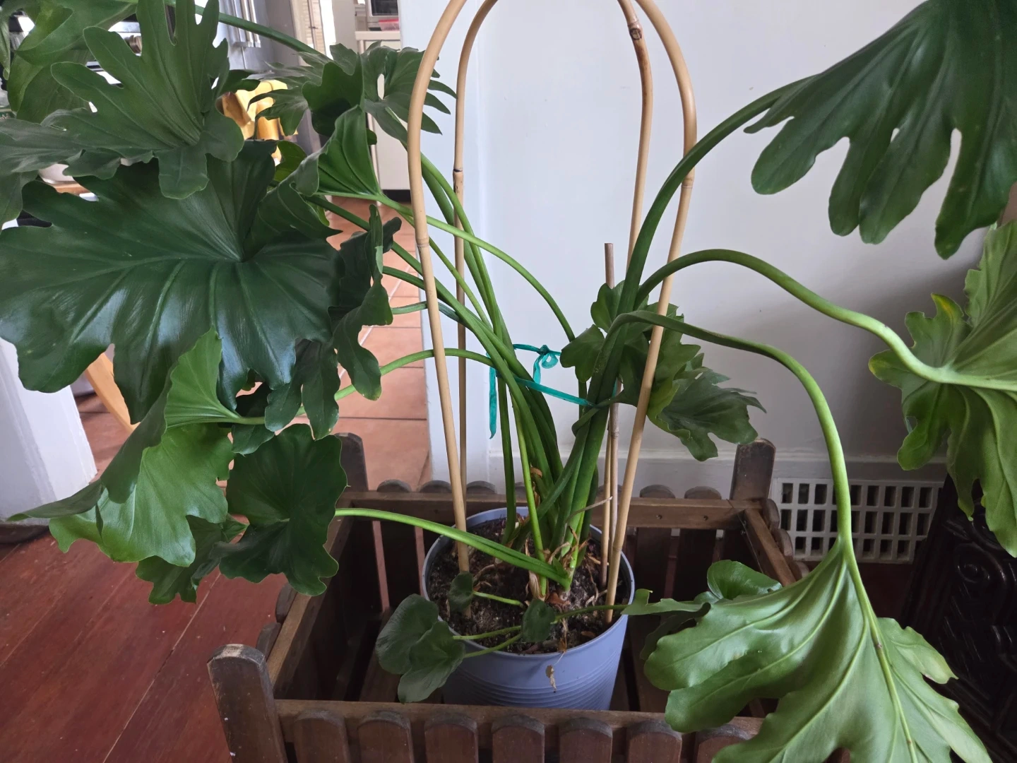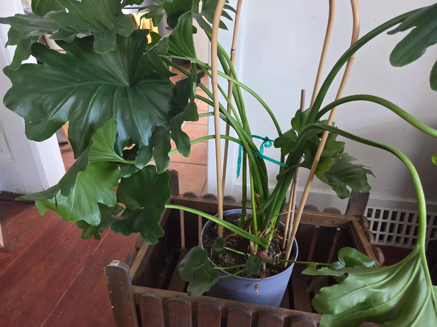 Large leafy green Philodendron Selloum plant in a grey pot, supported by bamboo stakes. It's in a wooden planter box. This plant thrives indoors and brings a tropical feel to your space!