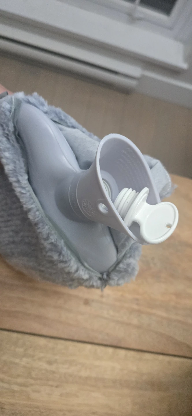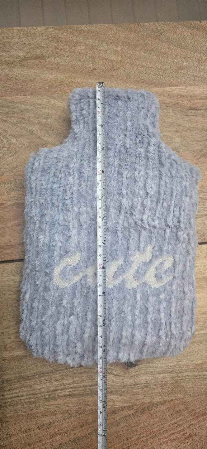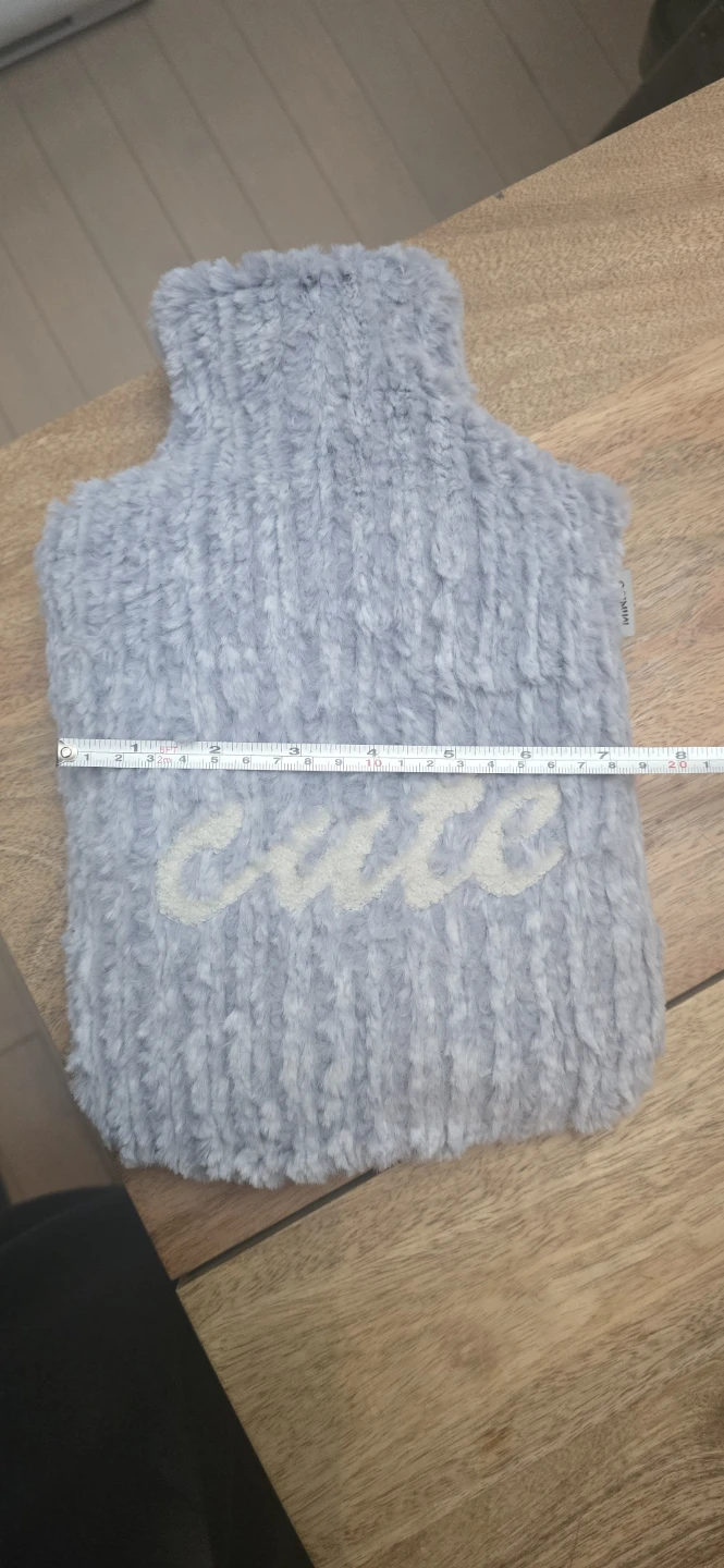 Stay cozy with this Miniso hot water bottle! It comes with a soft, plush cover that says "Cute" on it. The cover is a light blue/grey colour and the bottle is in great condition. It measures approximately 35cm in length and 20cm in width
