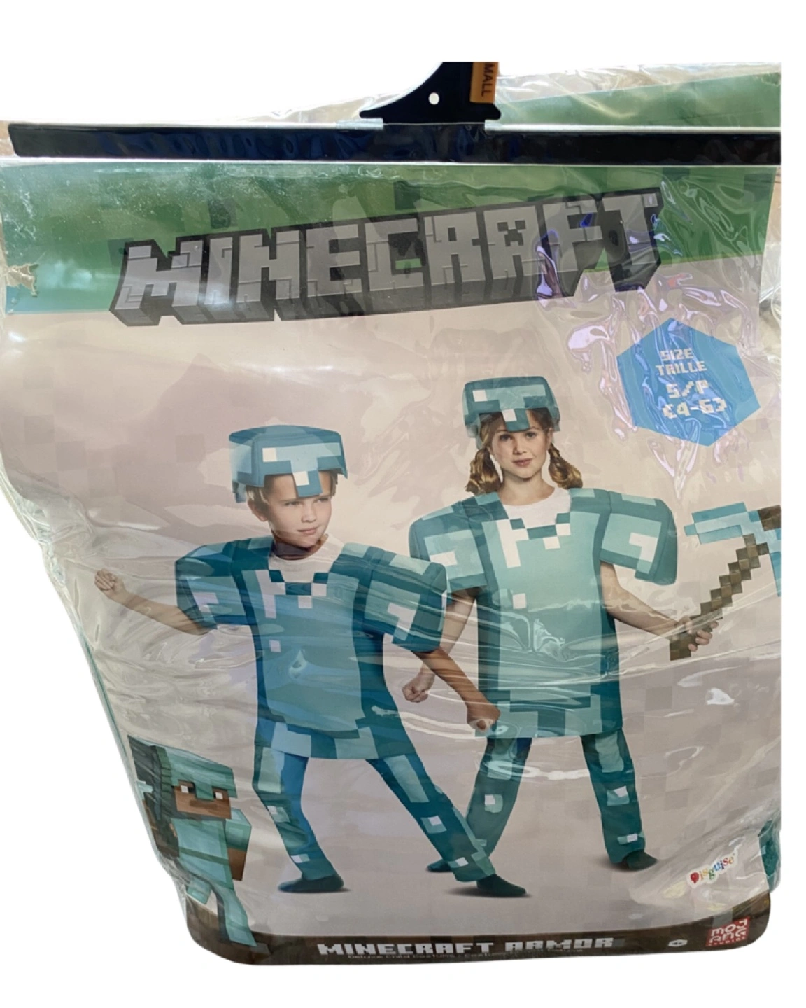 Selling a Minecraft armor costume! It comes with the full set: top, pants, and headpiece. The size is S, suitable for kids aged 5-6. It's in great condition and ready for a new adventure.