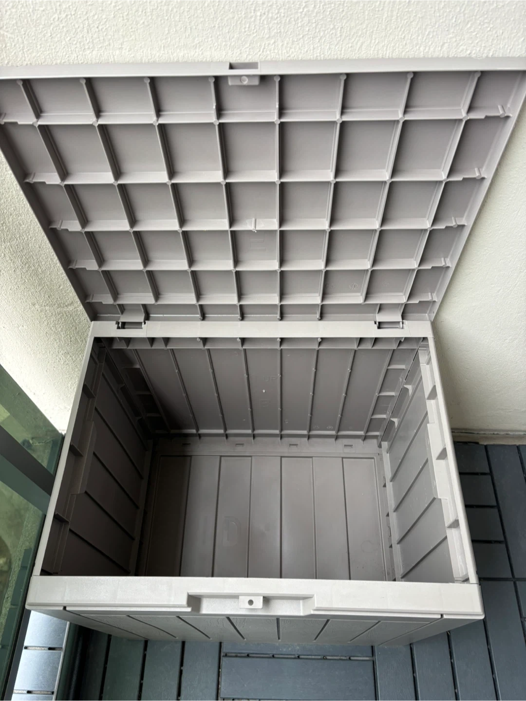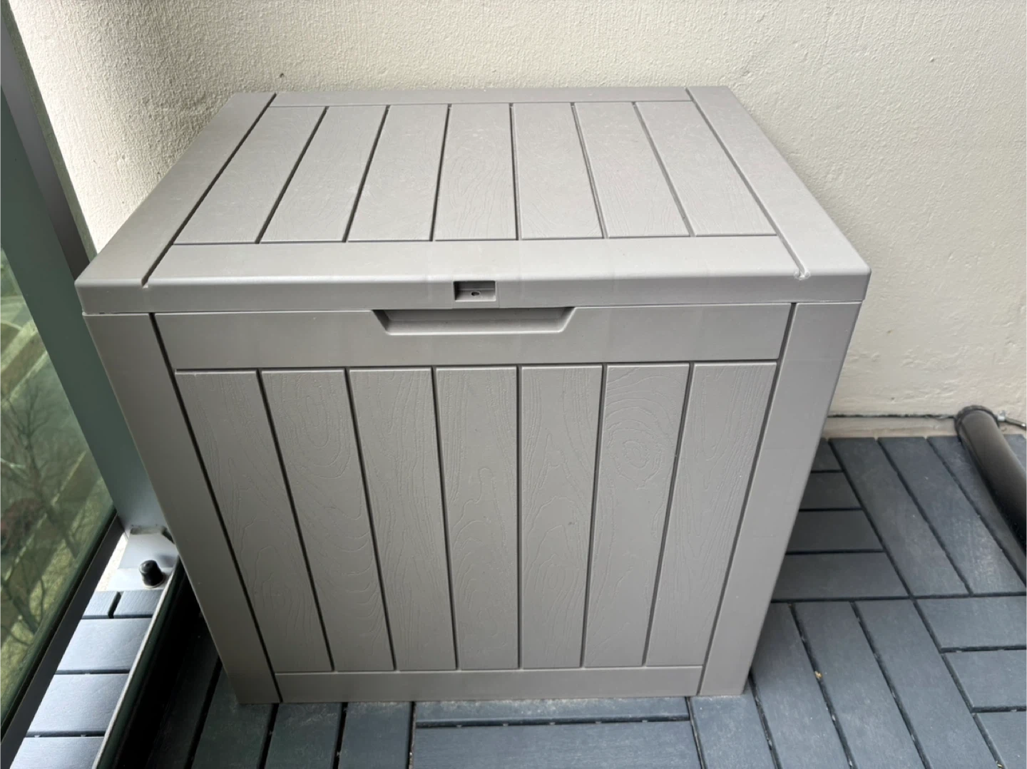 This grey outdoor storage box is made of durable plastic. It's perfect for storing patio cushions or gardening tools. The lid opens easily for convenient access. Can be used as additional seating if needed.