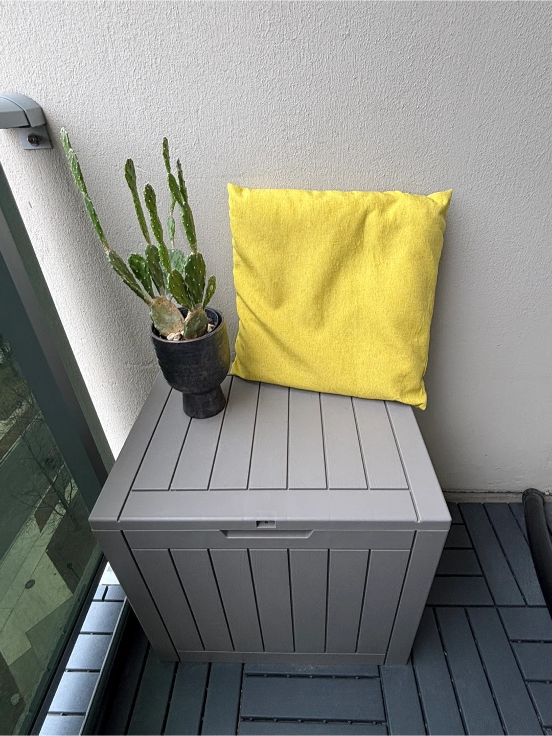 This grey outdoor storage box is made of durable plastic. It's perfect for storing patio cushions or gardening tools. The lid opens easily for convenient access. Can be used as additional seating if needed.