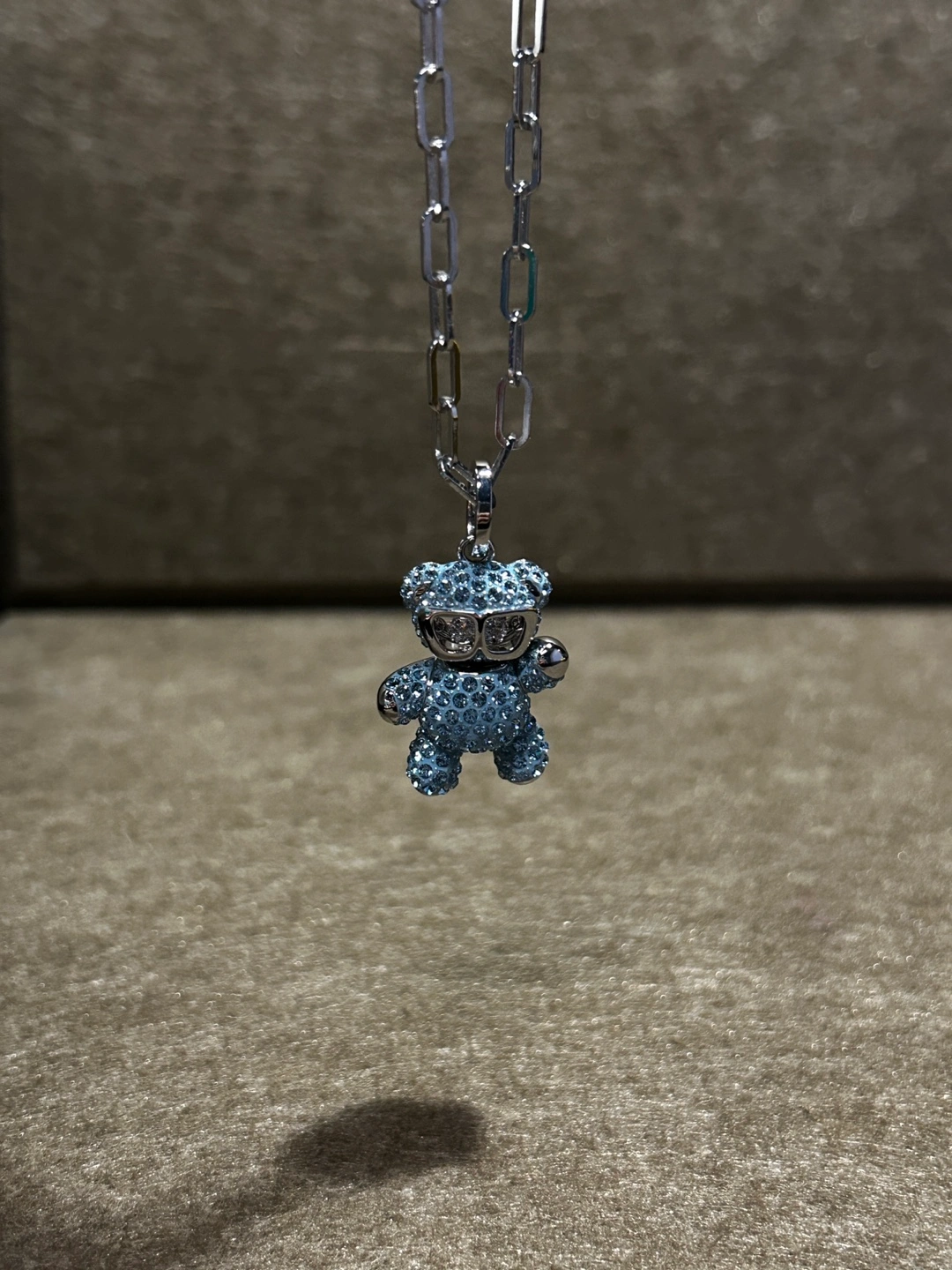Swarovski teddy bear pendant necklace. Features light blue crystals. Silver-tone chain. Comes in original box.