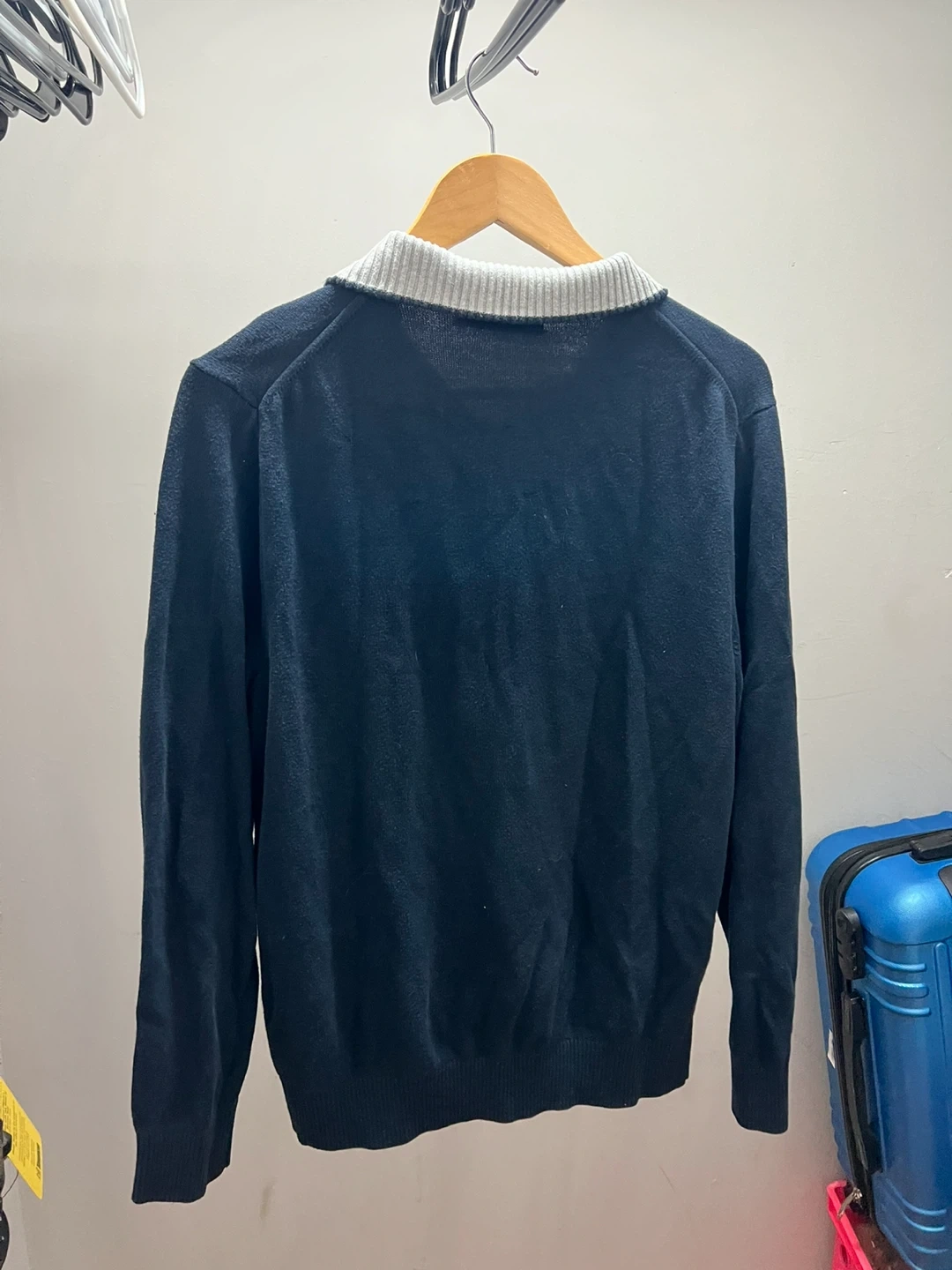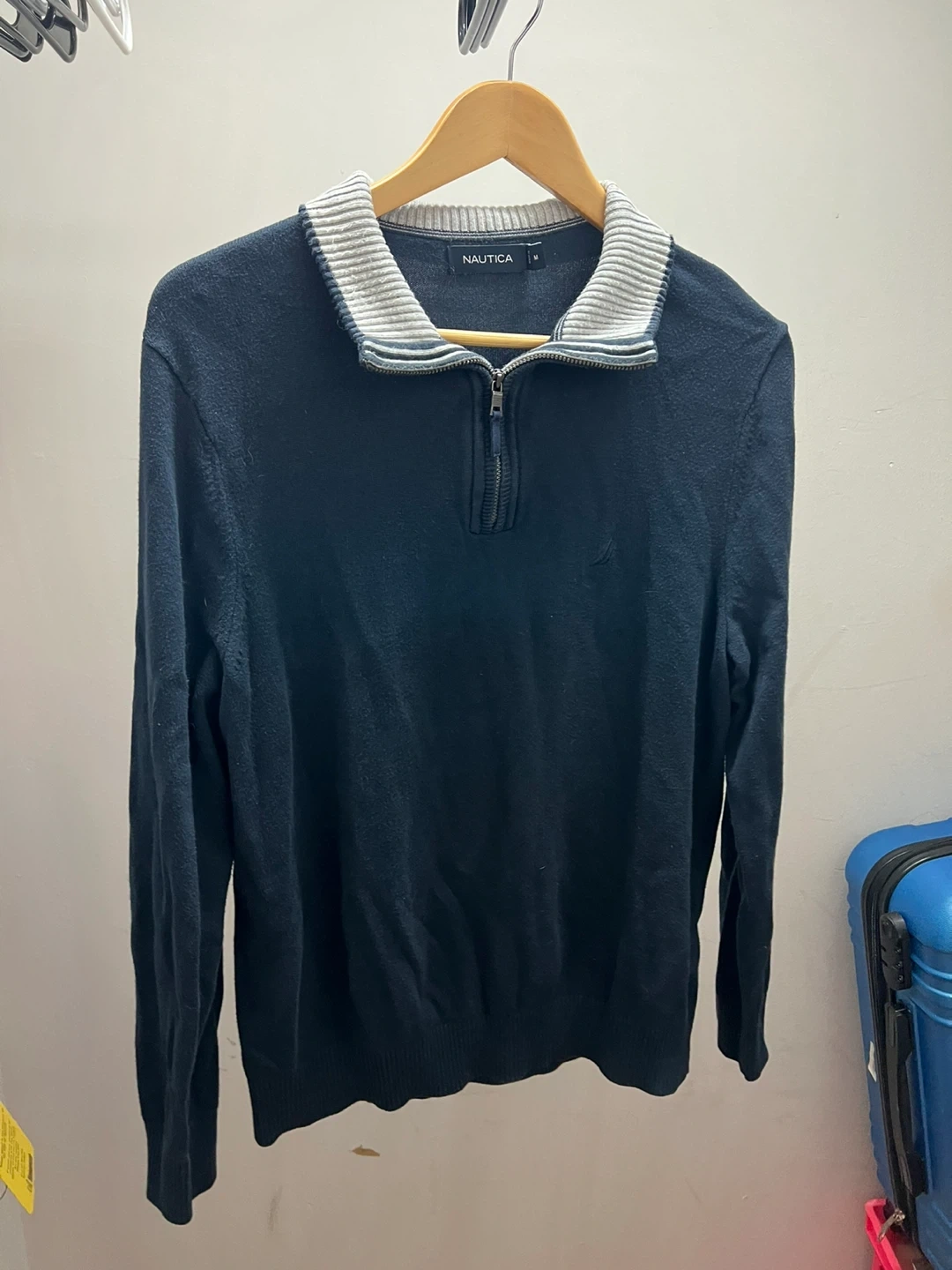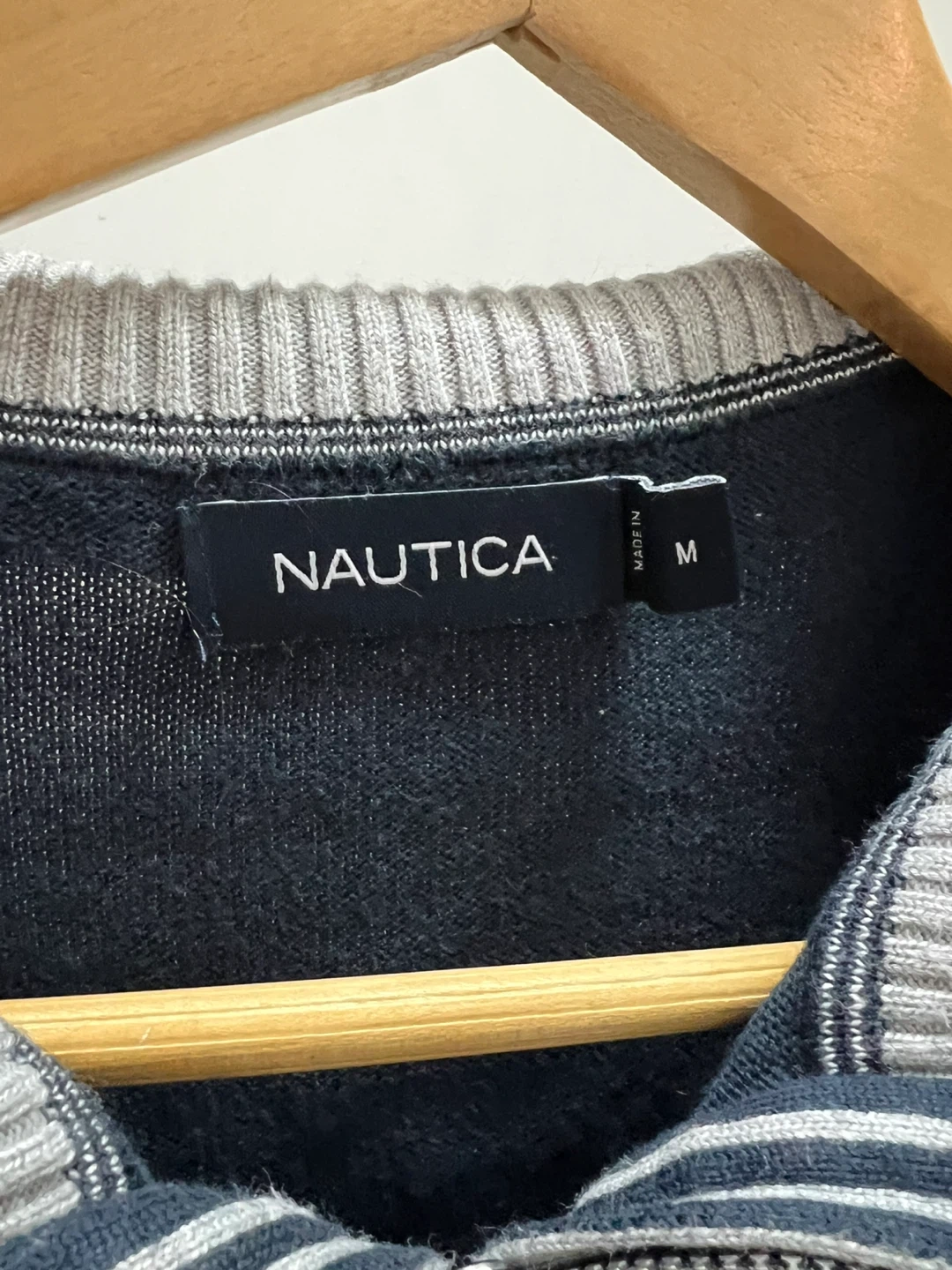 This is a Nautica quarter zip sweater in navy. It's a size medium with a striped collar and silver zipper. It's a great layering piece for cooler weather!