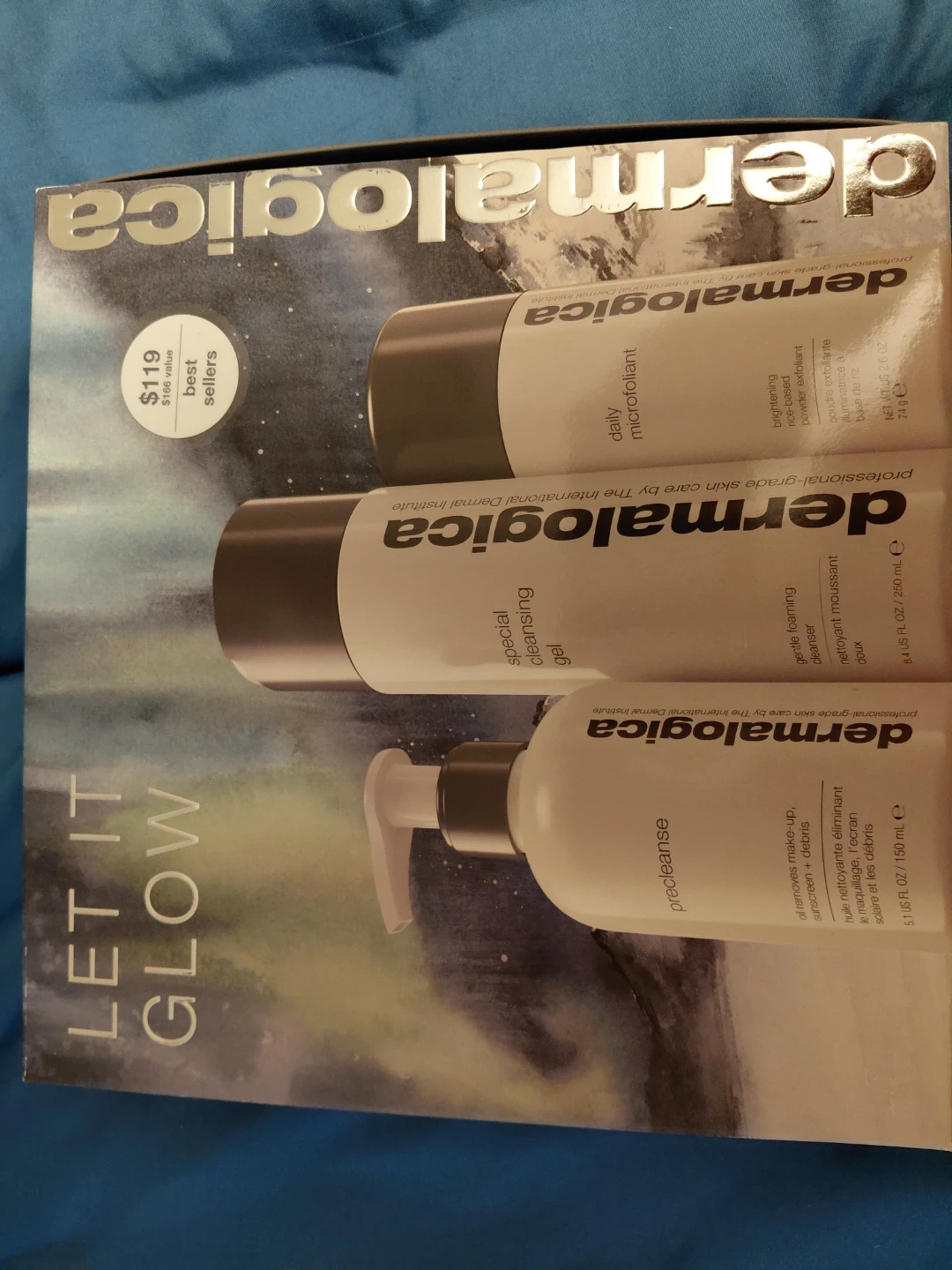 Selling a Dermalogica 'Let It Glow' set! This set includes Precleanse (5.1 US FL OZ/150 mLe), Special Cleansing Gel (8.4 US FL OZ/250 ml e), and Daily Microfoliant (NET WT US 2.6 OZ 74 ge). Originally bought for $119!